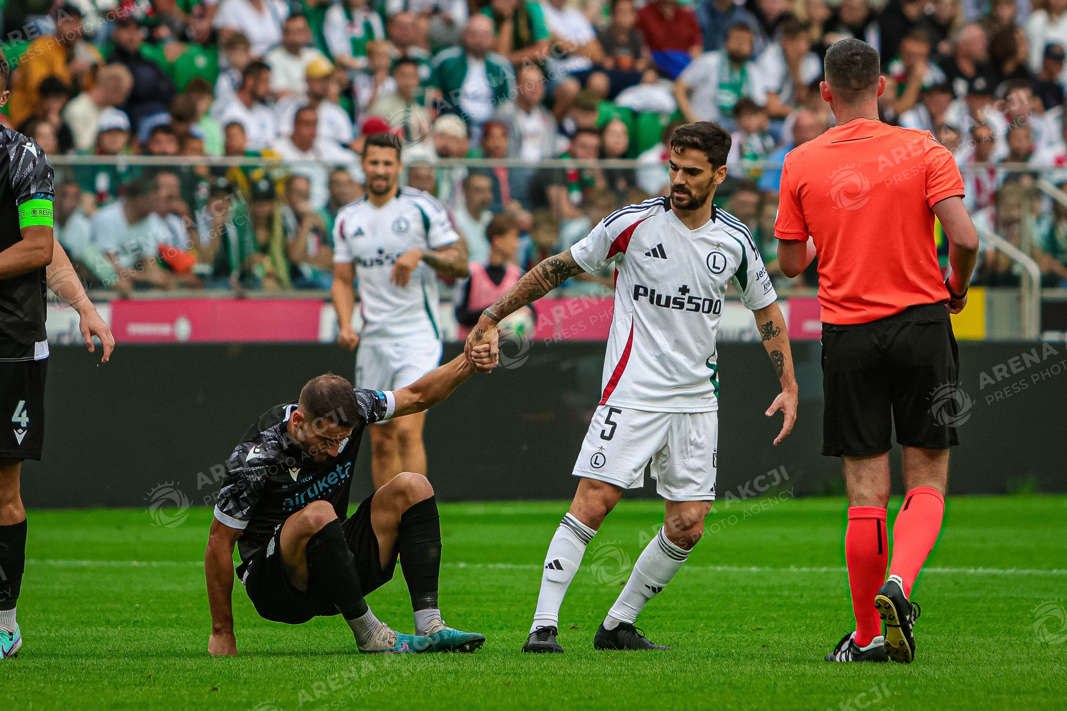 WARSAW, POLAND - 22.08.2024: Claude Goncalves of FC Drita helps an opponent off the pitch during the Europa Conference League elimination stage match against Legia Warszawa. Photo: Igor Jakubowski / Action Stream