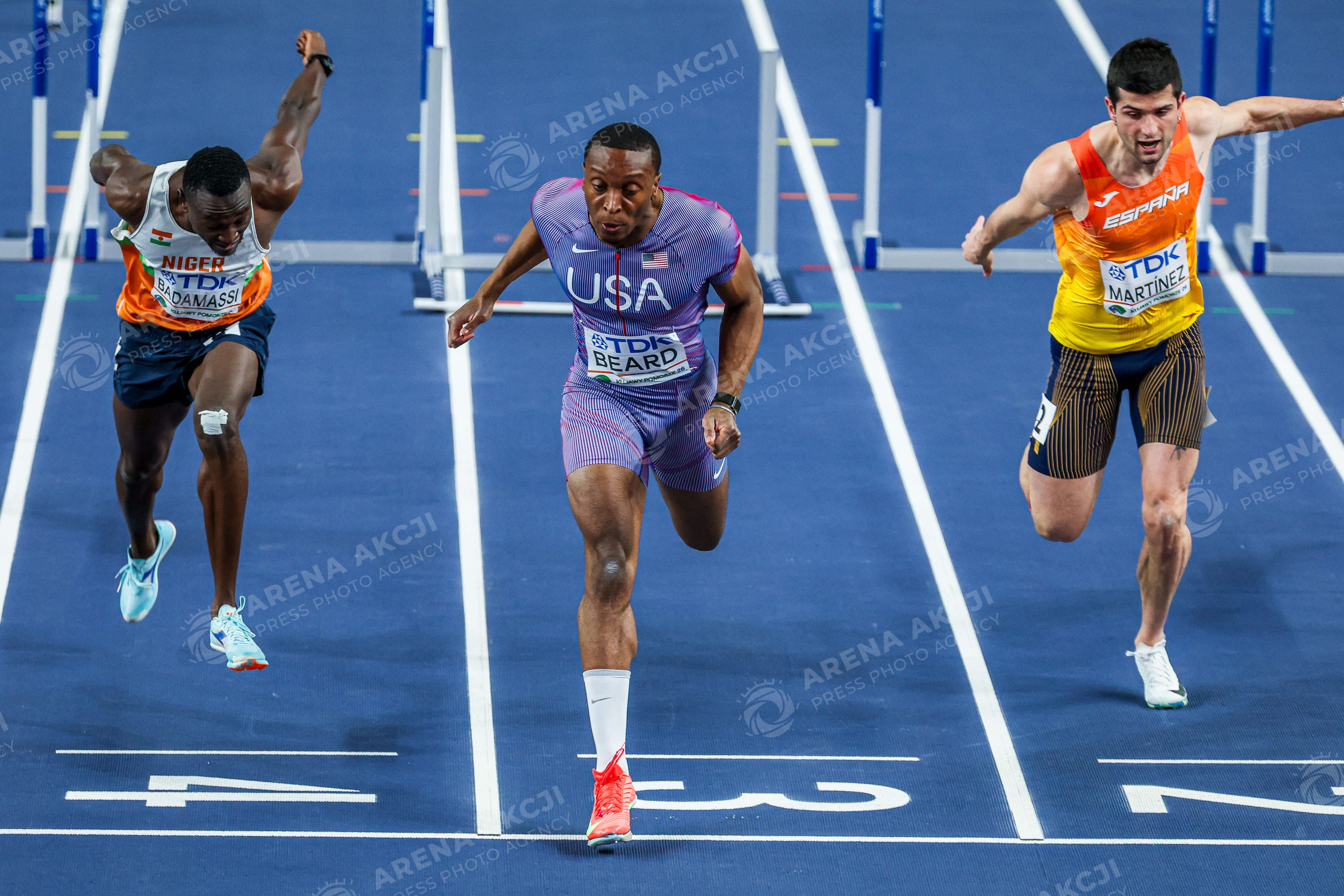 TORUN, POLAND - 21.03.2026: Dylan Beard, Saguirou Badamassi, and Asier Martinez compete during Day Two of the World Athletics Indoor Championship. Photo: Igor Jakubowski / Action Stream