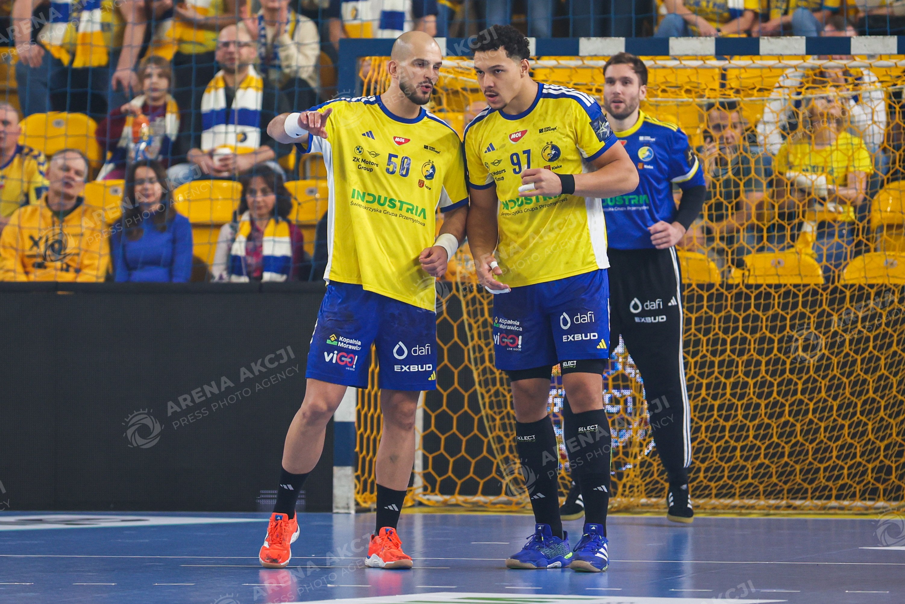 Kielce 26.11.2025. Pilka reczna liga mistrzow sezon 2025/2026 kolejka 10 mecz : Industria Kielce - Dynamo Bukareszt --- Handball EHF Champions League season 2025/2026 match : Industria Kielce - Dinamo Bucuresti nz arciom karalok ( artsem karalek ) theo monar Fot. Igor Jakubowski / Arena Akcji