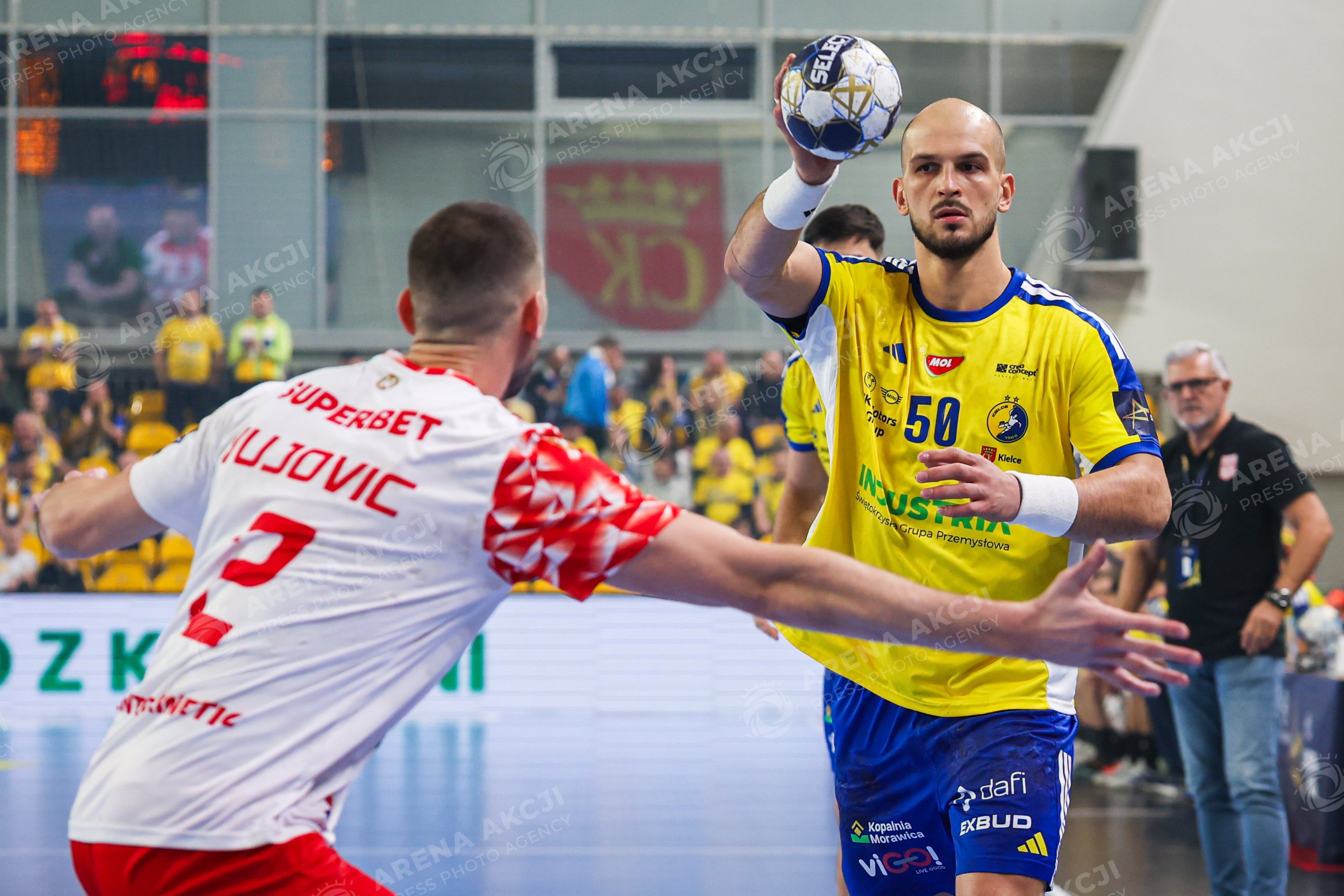 Kielce 26.11.2025. Pilka reczna liga mistrzow sezon 2025/2026 kolejka 10 mecz : Industria Kielce - Dynamo Bukareszt --- Handball EHF Champions League season 2025/2026 match : Industria Kielce - Dinamo Bucuresti nz arciom karalok ( artsem karalek ) Fot. Igor Jakubowski / Arena Akcji