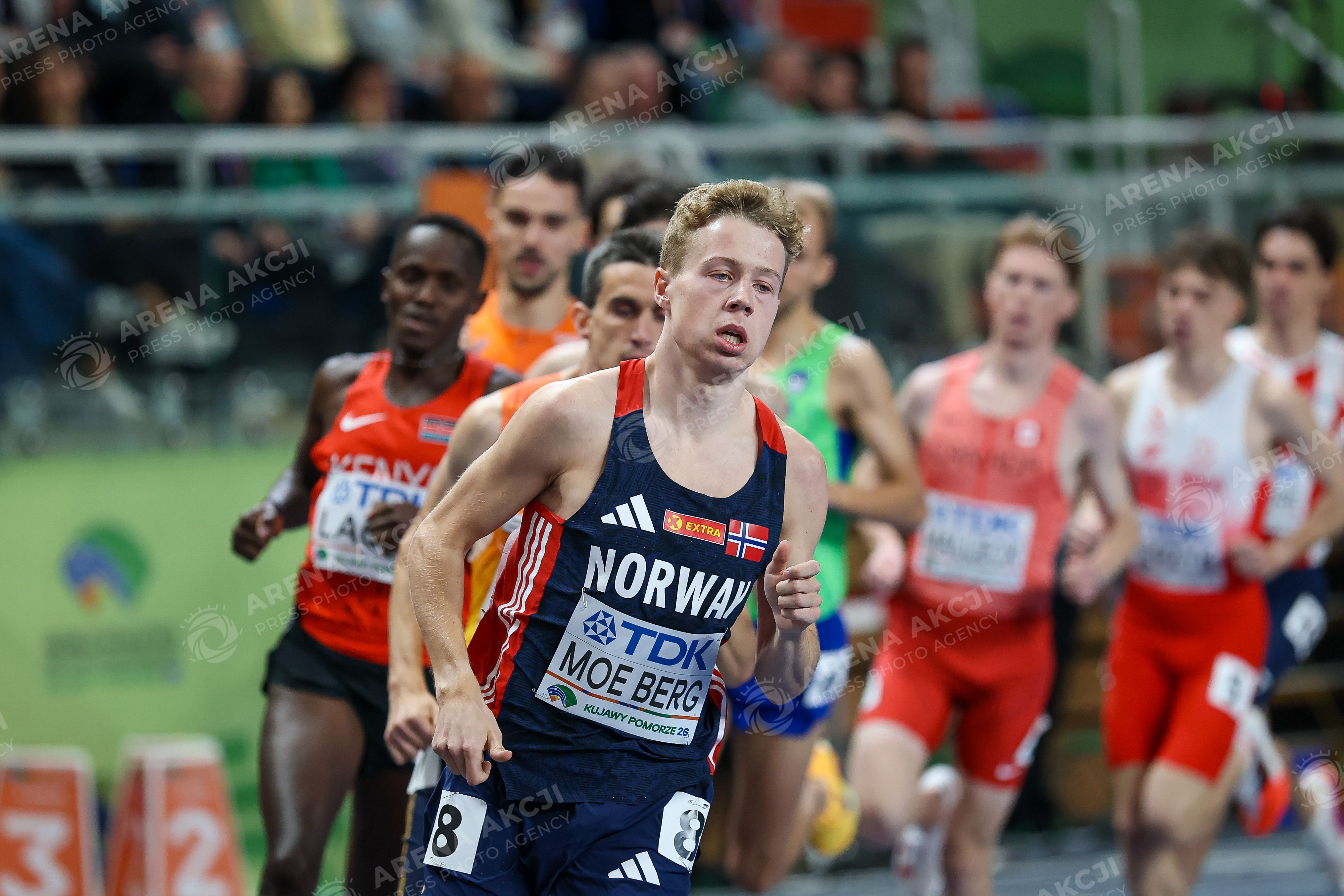 Torun 20.03.2026. World Athletics Indoor Championship Kujawy Pomorze 2026 in Torun, Poland Day 1 --- Lekka atletyka Lekkoatletyka Halowe Mistrzostwa Swiata Torun 2026 Dzien 1 Bieg mezczyzn 1500 metrow Men run 1500 meters Persons Sown : Hakon Moe Berg NOR Fot. Igor Jakubowski / Arena Akcji