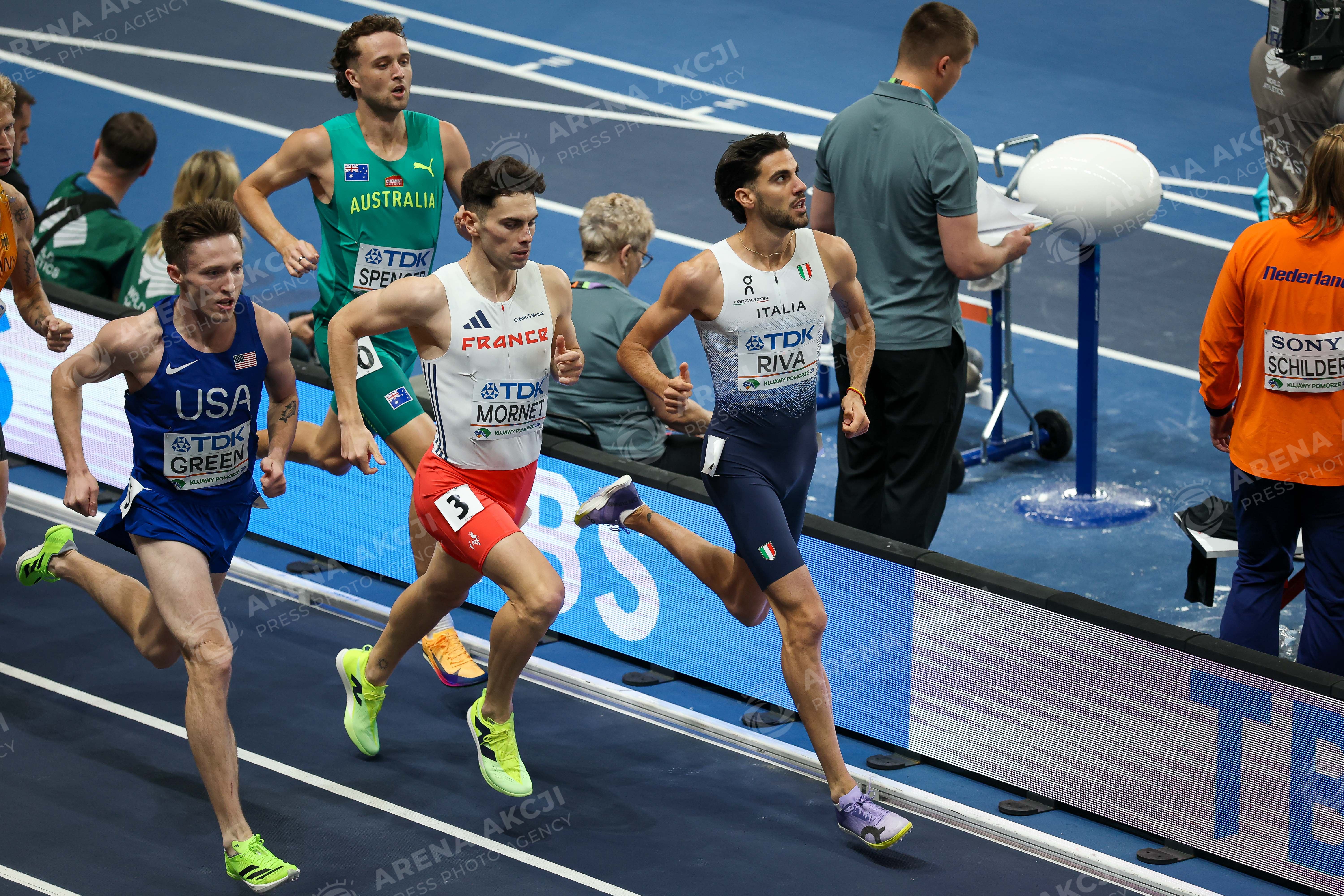Torun 20.03.2026. World Athletics Indoor Championship Kujawy Pomorze 2026 in Torun, Poland Day 1 --- Lekka atletyka Lekkoatletyka Halowe Mistrzostwa Swiata Torun 2026 Dzien 1 Bieg mezczyzn 1500 metrow Men run 1500 meters Persons Sown : Federico Riva ITA Romain Mornet FRA Fot. Igor Jakubowski / Arena Akcji