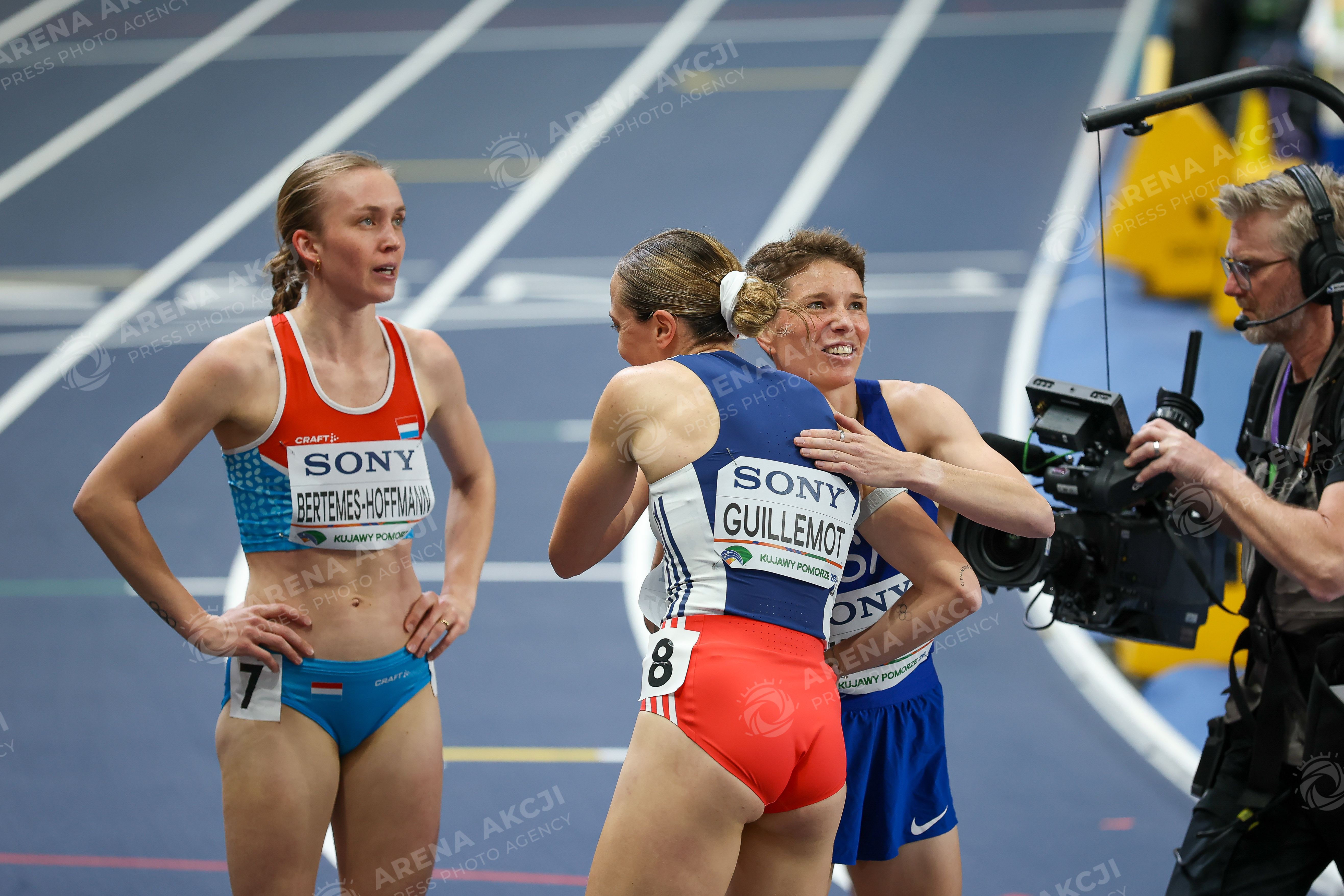 Torun 20.03.2026. World Athletics Indoor Championship Kujawy Pomorze 2026 in Torun, Poland Day 1 --- Lekka atletyka Lekkoatletyka Halowe Mistrzostwa Swiata Torun 2026 Dzien 1 Bieg kobiet 1500 metrow Women run 1500 meters Persons Sown : Nikki Hiltz USA Vera Bertemes-Hoffmann LUX Agathe Guillemot FRA Fot. Igor Jakubowski / Arena Akcji