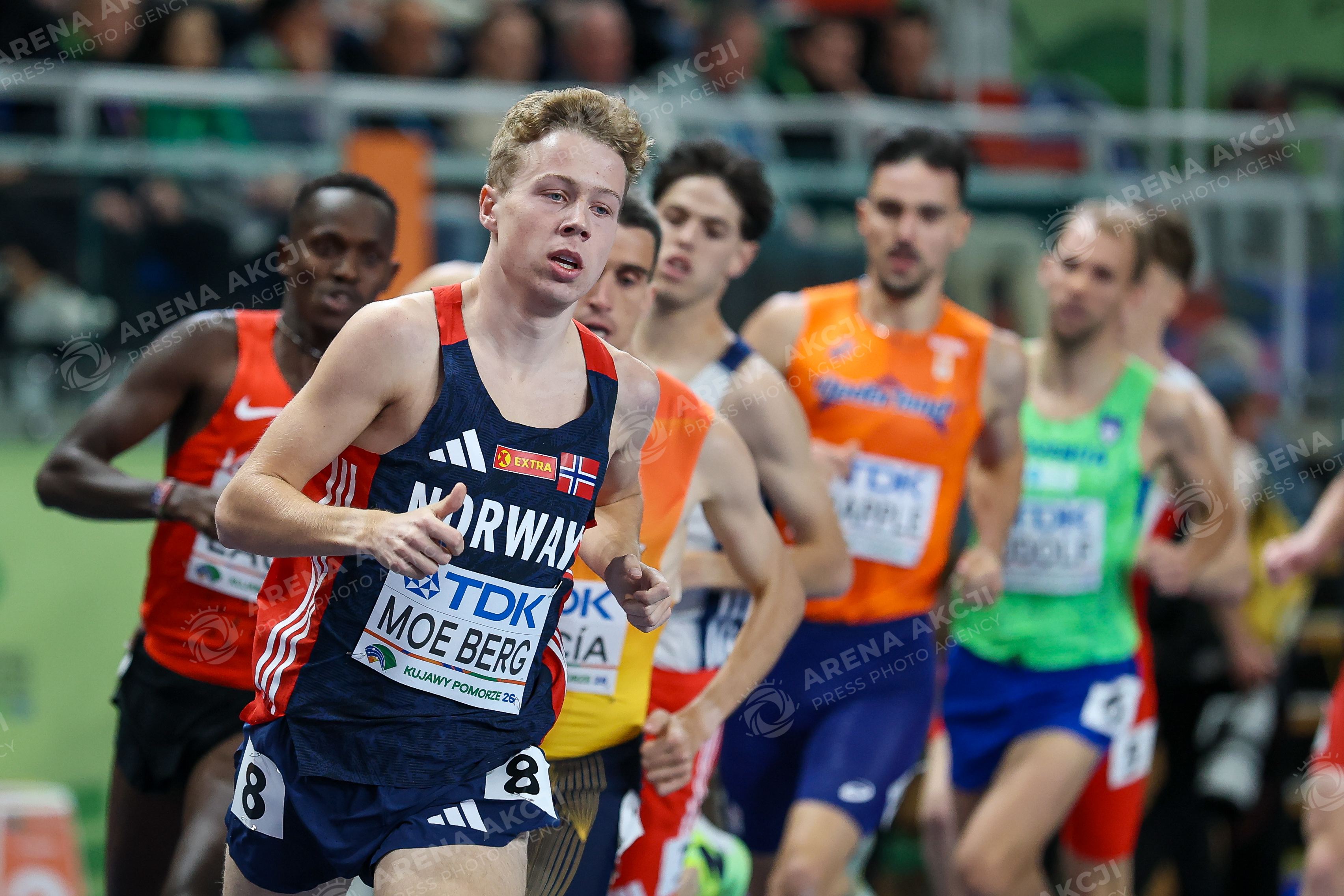 Torun 20.03.2026. World Athletics Indoor Championship Kujawy Pomorze 2026 in Torun, Poland Day 1 --- Lekka atletyka Lekkoatletyka Halowe Mistrzostwa Swiata Torun 2026 Dzien 1 Bieg mezczyzn 1500 metrow Men run 1500 meters Persons Sown : Hakon Moe Berg NOR Fot. Igor Jakubowski / Arena Akcji