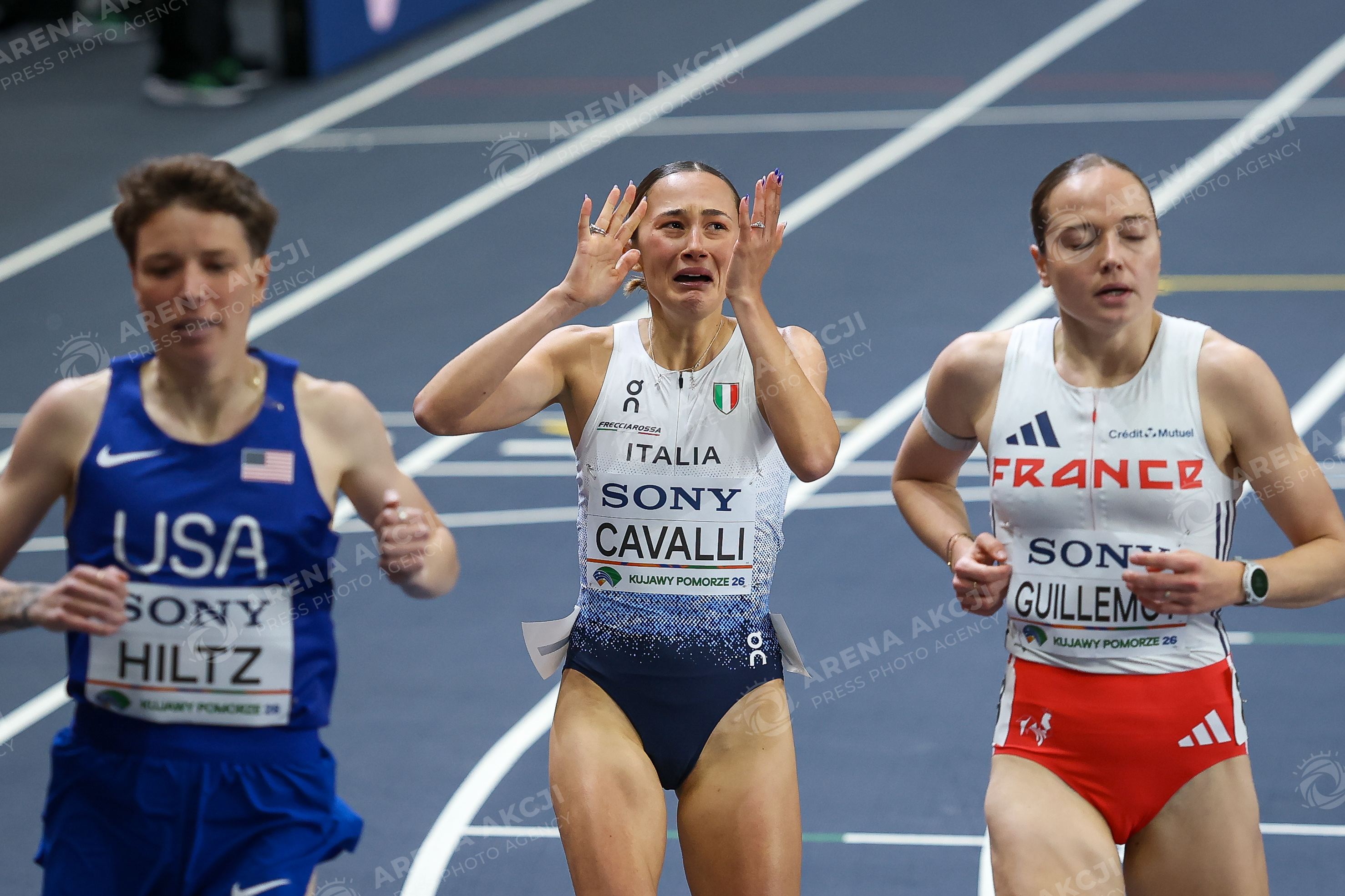 Torun 20.03.2026. World Athletics Indoor Championship Kujawy Pomorze 2026 in Torun, Poland Day 1 --- Lekka atletyka Lekkoatletyka Halowe Mistrzostwa Swiata Torun 2026 Dzien 1 Bieg kobiet 1500 metrow Women run 1500 meters Persons Sown : Ludovica Cavalli ITA Agathe Guillemot FRA Fot. Igor Jakubowski / Arena Akcji