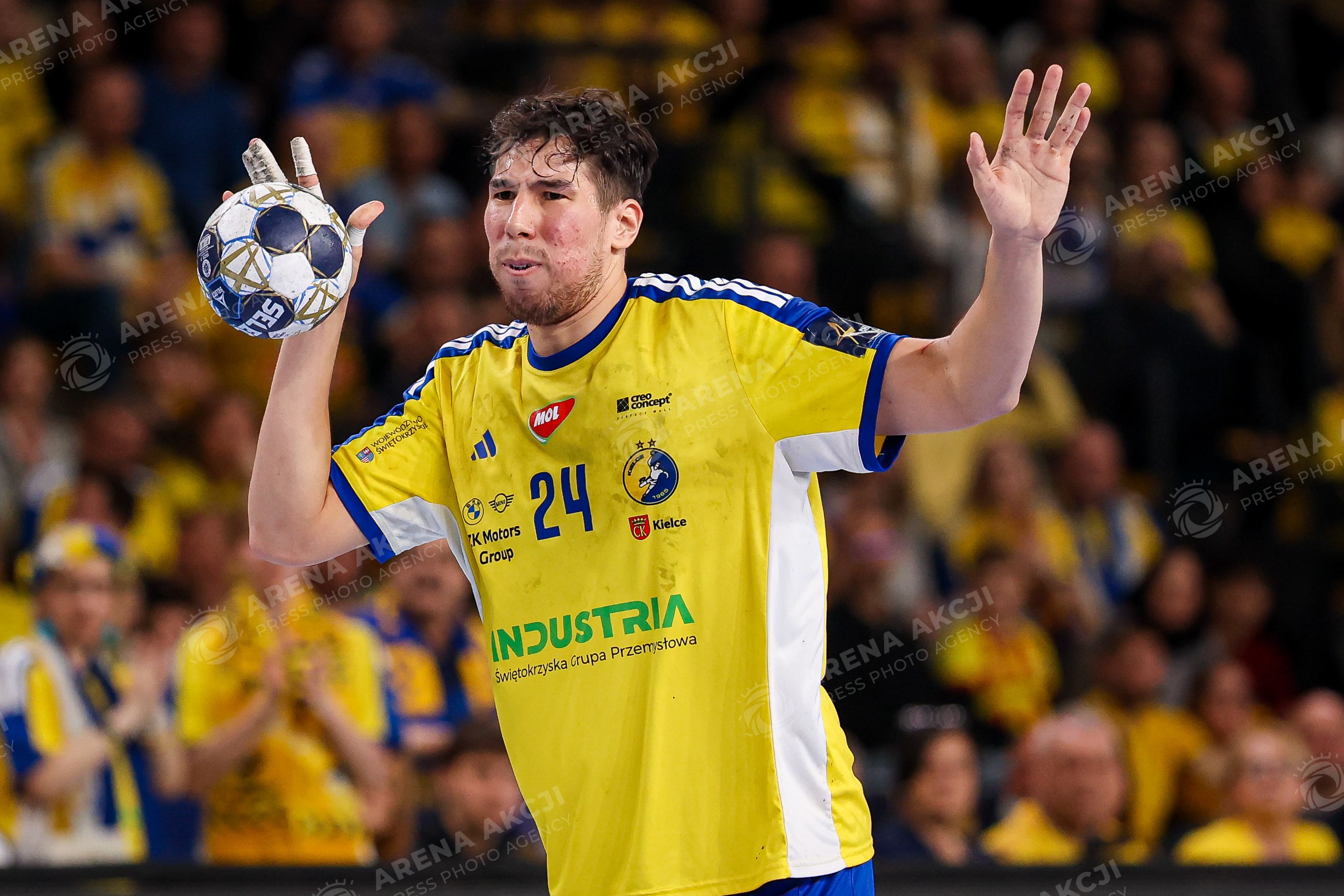 Kielce 04.03.2026. Pilka reczna EHF Liga Mistrzow sezon 2025/2026 kolejka 13 mecz: Industria Kielce - Sporting Lizbona --- Handball EHF Champions League season 2025/2026 round 13 match between Industria Kielce and Sporting Lisbon in Kielce, Poland Persons Shown : Daniel Dujshebaev kontuzja uraz Fot. Igor Jakubowski / Arena Akcji