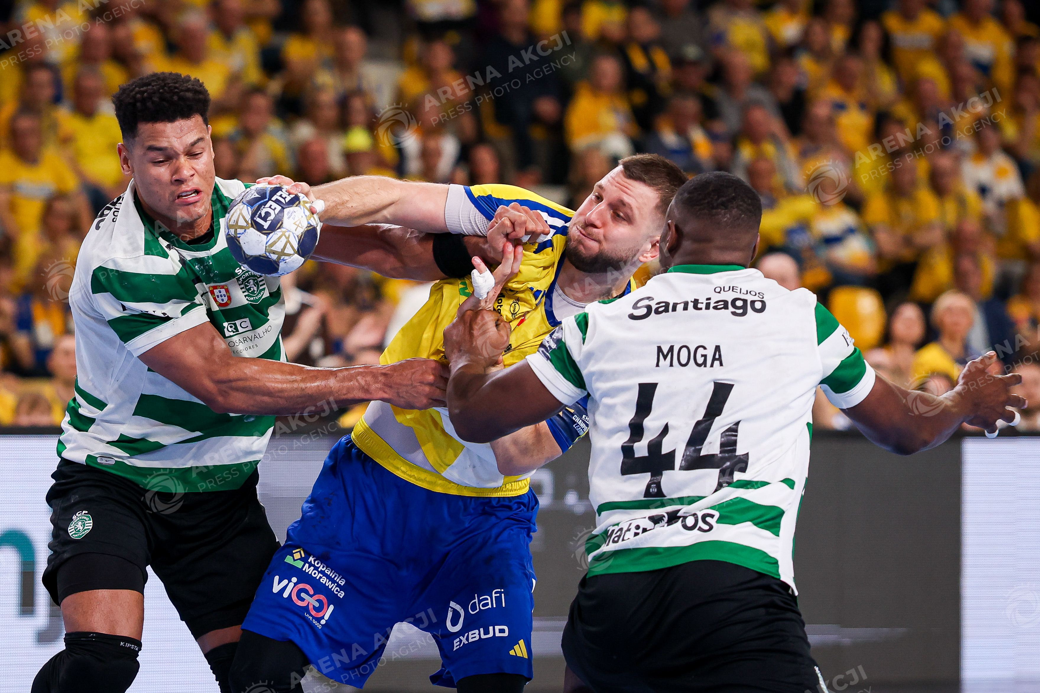 Kielce 04.03.2026. Pilka reczna EHF Liga Mistrzow sezon 2025/2026 kolejka 13 mecz: Industria Kielce - Sporting Lizbona --- Handball EHF Champions League season 2025/2026 round 13 match between Industria Kielce and Sporting Lisbon in Kielce, Poland Persons Shown : Edney Oliveira Yahoza Moga Christian Aleks Vlah Fot. Igor Jakubowski / Arena Akcji