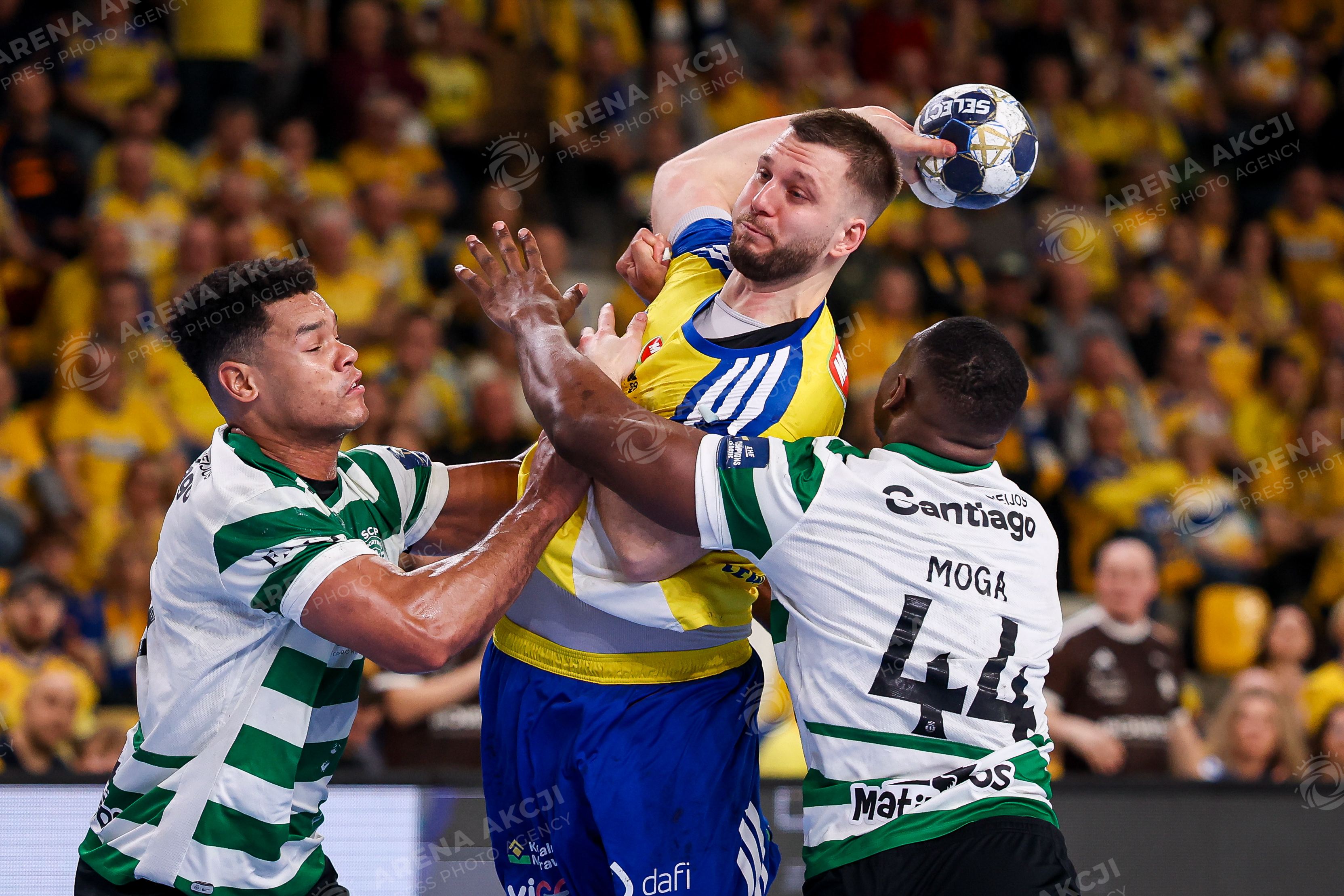 Kielce 04.03.2026. Pilka reczna EHF Liga Mistrzow sezon 2025/2026 kolejka 13 mecz: Industria Kielce - Sporting Lizbona --- Handball EHF Champions League season 2025/2026 round 13 match between Industria Kielce and Sporting Lisbon in Kielce, Poland Persons Shown : Aleks Vlah Edney Oliveira Yahoza Moga Christian Fot. Igor Jakubowski / Arena Akcji