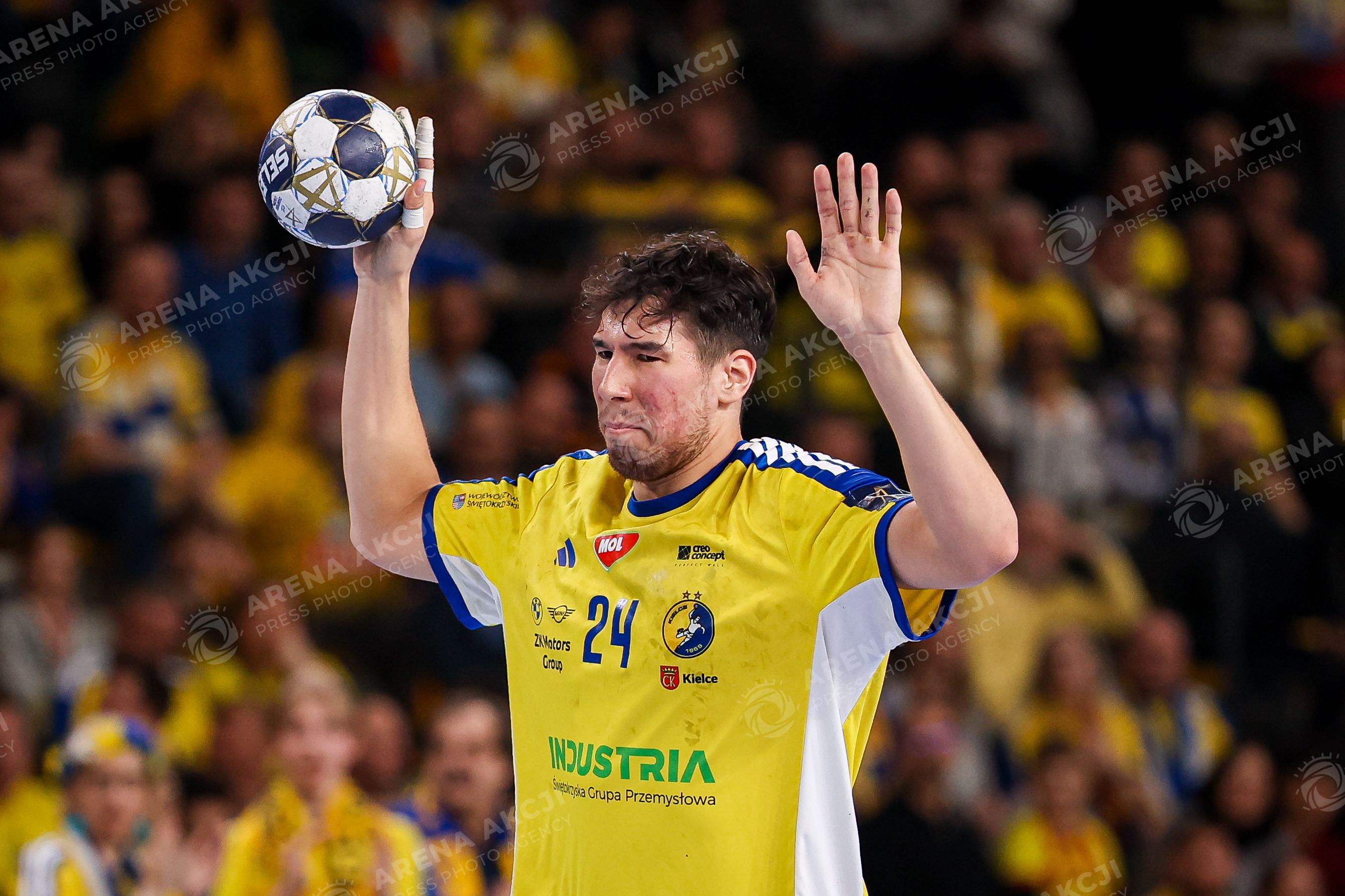 Kielce 04.03.2026. Pilka reczna EHF Liga Mistrzow sezon 2025/2026 kolejka 13 mecz: Industria Kielce - Sporting Lizbona --- Handball EHF Champions League season 2025/2026 round 13 match between Industria Kielce and Sporting Lisbon in Kielce, Poland Persons Shown : Daniel Dujshebaev kontuzja uraz Fot. Igor Jakubowski / Arena Akcji