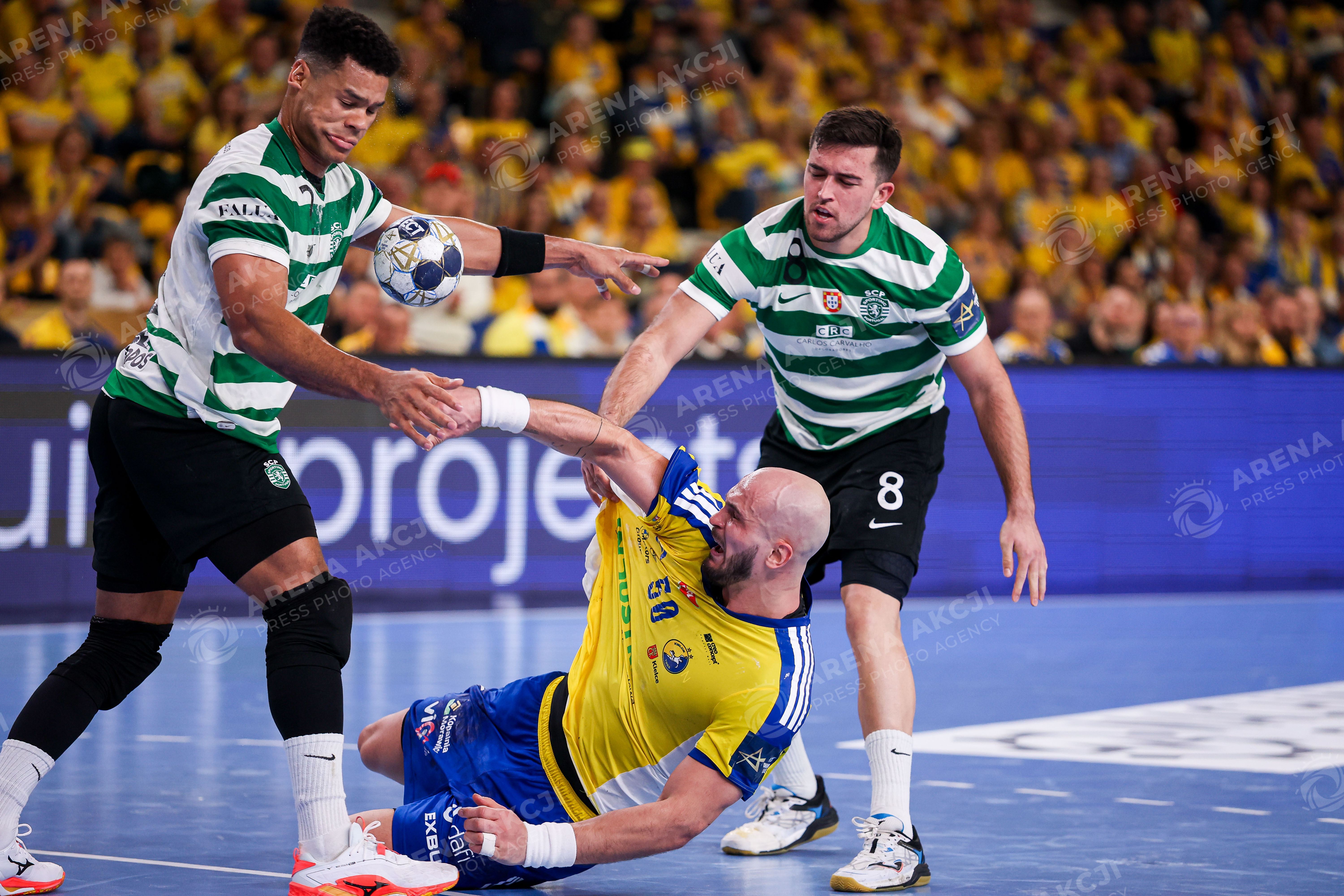 Kielce 04.03.2026. Pilka reczna EHF Liga Mistrzow sezon 2025/2026 kolejka 13 mecz: Industria Kielce - Sporting Lizbona --- Handball EHF Champions League season 2025/2026 round 13 match between Industria Kielce and Sporting Lisbon in Kielce, Poland Persons Shown : Artsem Karalek Aregay Gurri Jan Fot. Igor Jakubowski / Arena Akcji