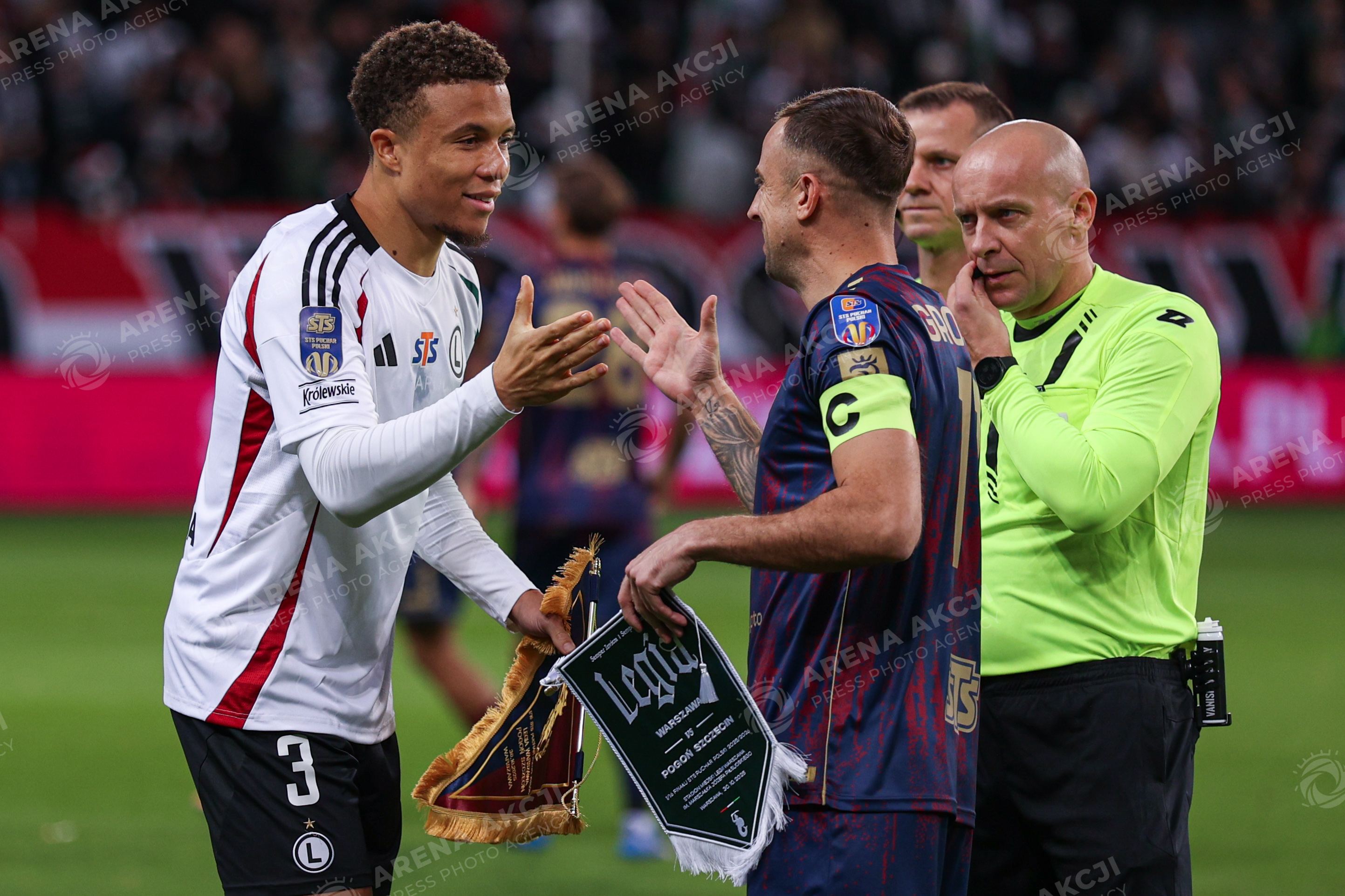 Warszawa 30.10.2025. Pilka nozna STS Puchar Polski sezon 2025/2026 runda 1/16 finalu mecz: Legia Warszawa - Pogon Szczecin --- Football STS Polish Cup season 2025/2026 round 116 match: Legia Warsaw - Pogon Szczecin nz Steve Kapuadi Kamil Grosicki Szymon Marciniak Fot. Igor Jakubowski / Arena Akcji