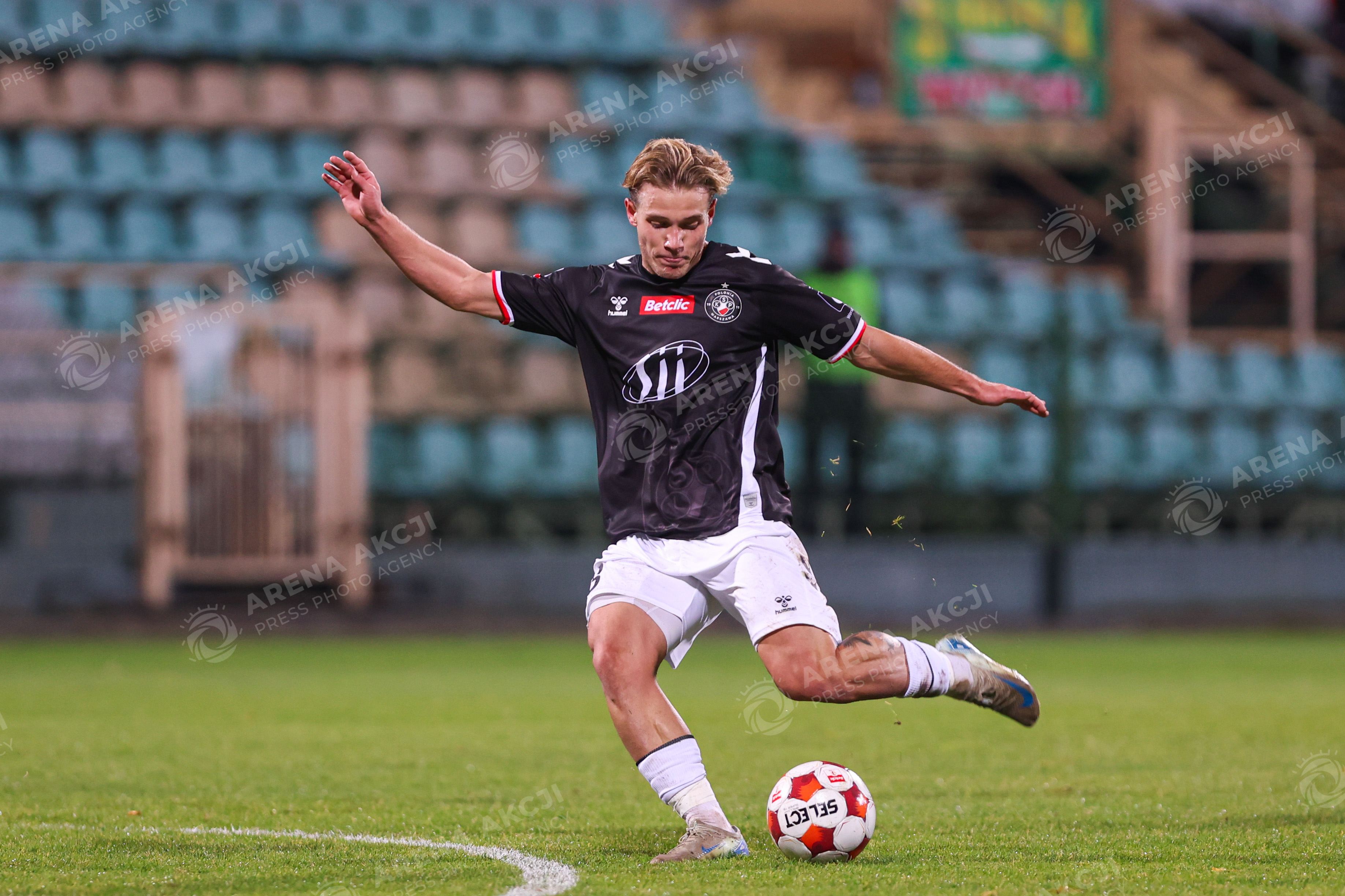 Leczna 31.10.2025. Pilka nozna Betclic I Liga sezon 2025/2026 kolejka 15 mecz: Gornik Leczna - Polonia Warszawa --- Football Betclic I League season 2025/2026 round 15 match: Gornik Leczna - Polonia Warsaw nz Oliwier Wojciechowski strzal Fot. Igor Jakubowski / Arena Akcji