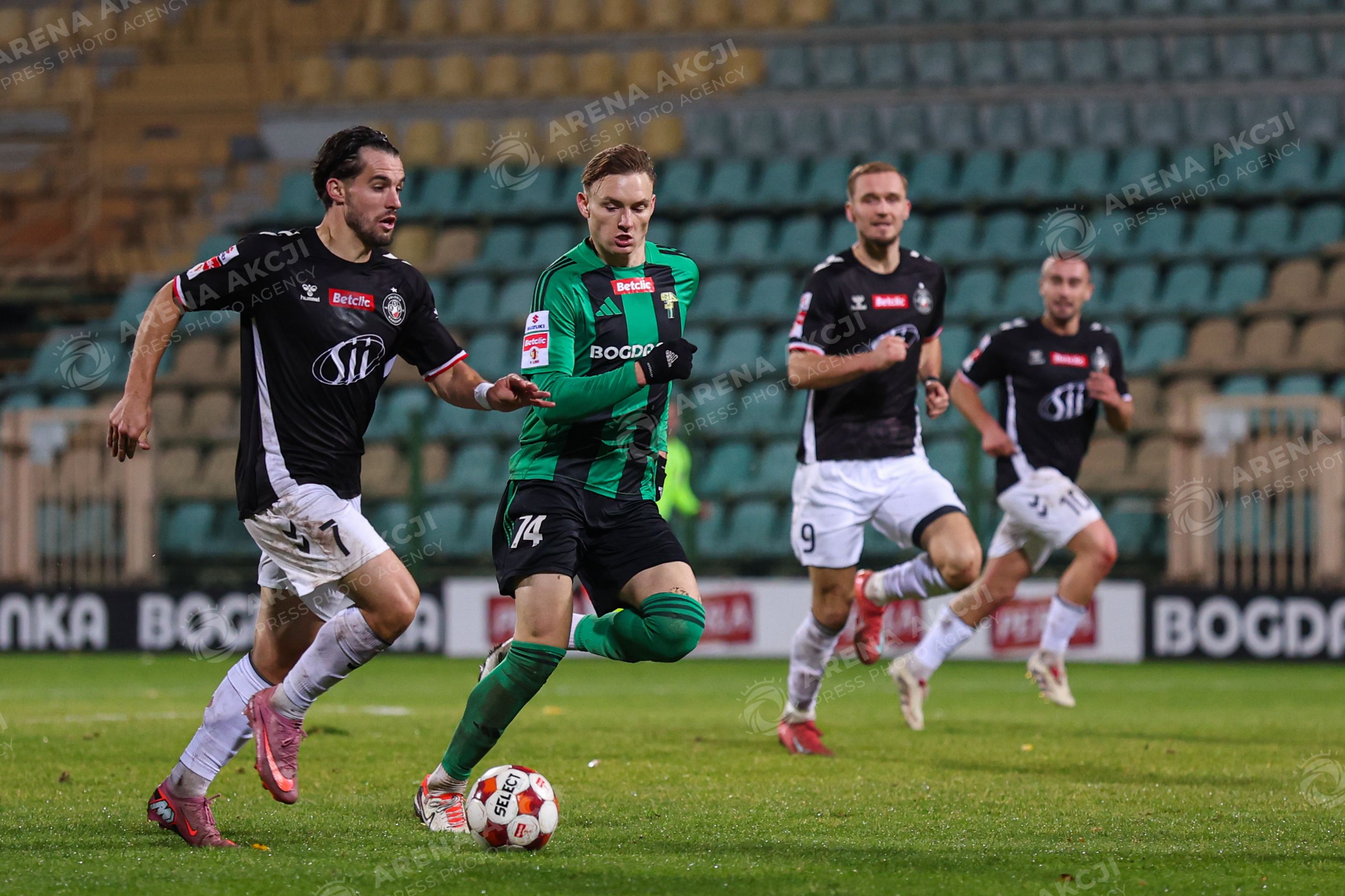 Leczna 31.10.2025. Pilka nozna Betclic I Liga sezon 2025/2026 kolejka 15 mecz: Gornik Leczna - Polonia Warszawa --- Football Betclic I League season 2025/2026 round 15 match: Gornik Leczna - Polonia Warsaw nz Dani Vega Filip Szabaciuk Fot. Igor Jakubowski / Arena Akcji