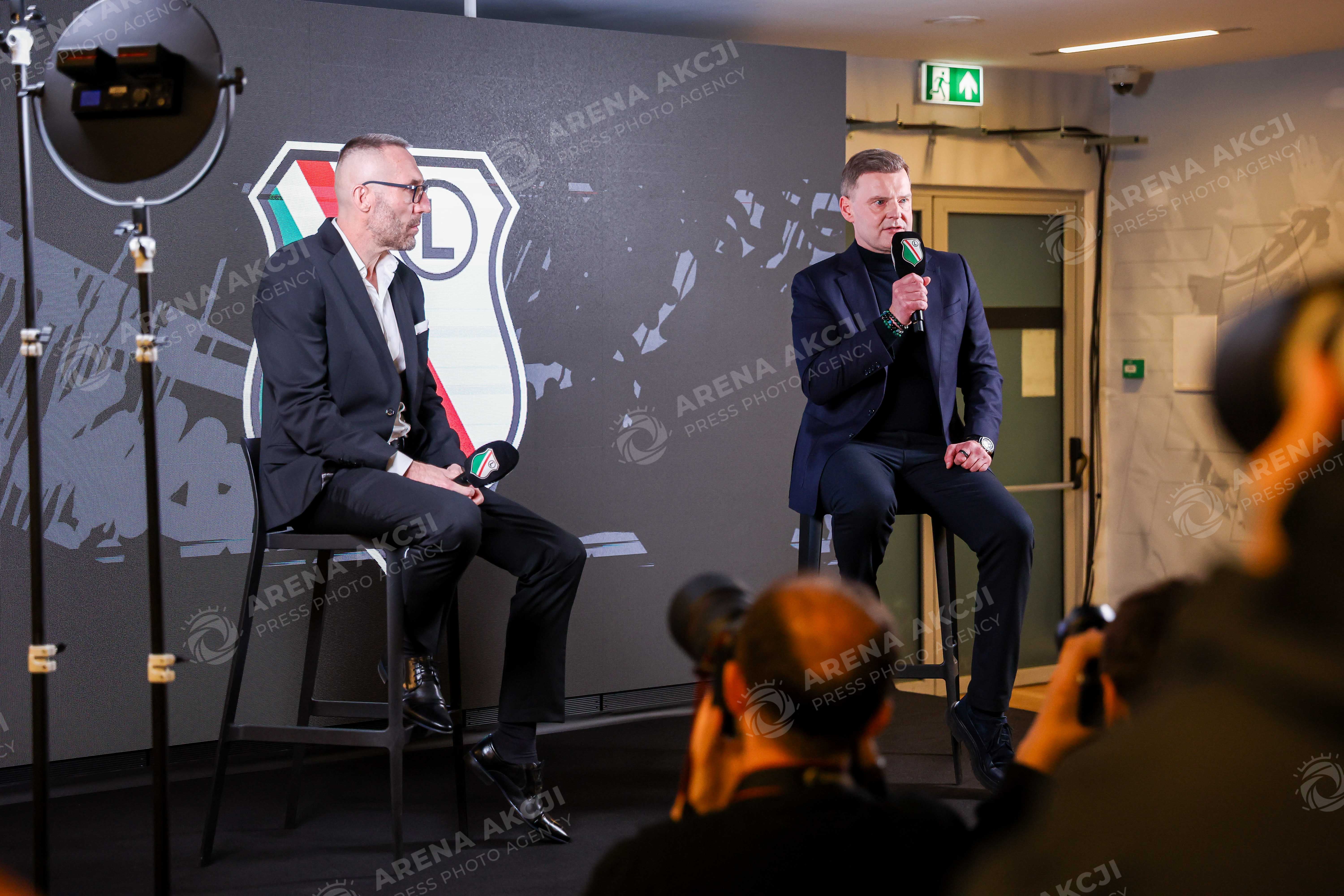 Warszawa 19.12.2025. Briefing Prasowy. Prezentacja nowego trenera Legii Warszawa Marka Papszuna --- Press briefing. Presentation of new Legia Warsaw Head Coach Marek Papszun nz Marek Papszun Marcin Herra Fot. Igor Jakubowski / Arena Akcji