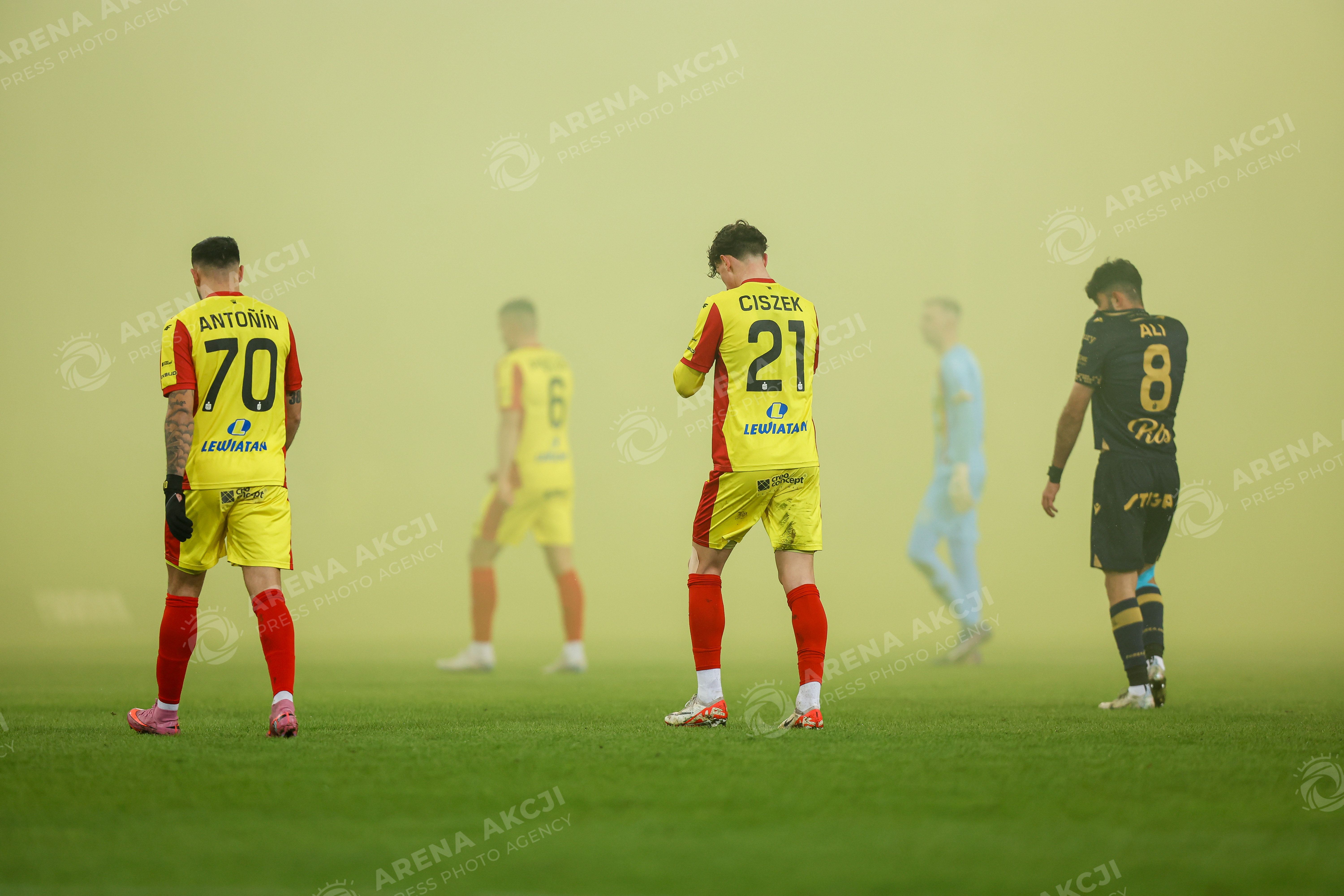 Kielce 22.02.2026. Pilka nozna PKO BP Ekstraklasa sezon 2025/2026 kolejka 22 mecz Korona Kielce - Lech Poznan --- Football Soccer Polish first division. match between Korona Kielce and Lech Poznan in Kielce, Poland. Persons shown : zejscie z boiska oprawa dymy Fot. Igor Jakubowski / Arena Akcji