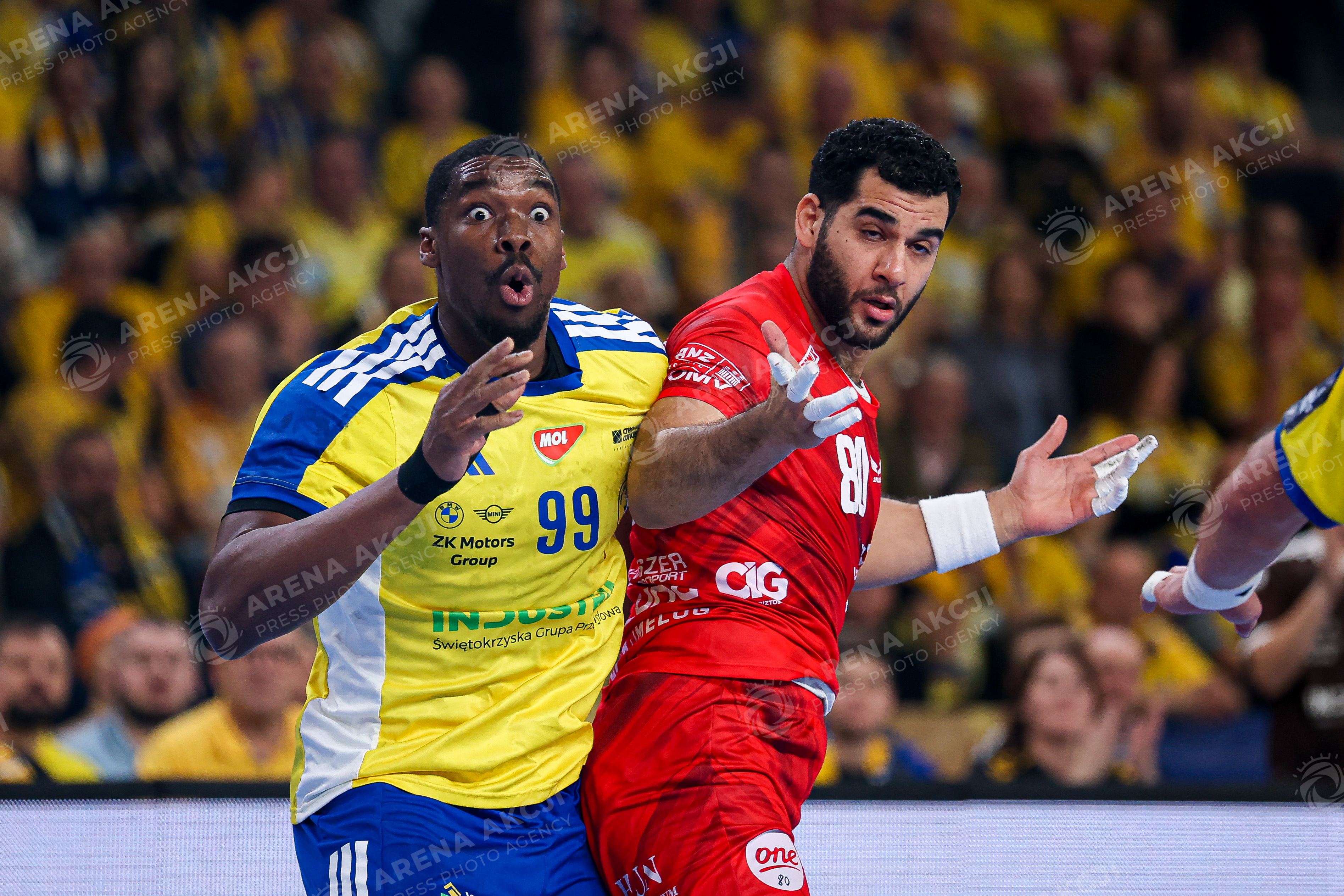 Kielce 19.02.2026. Pilka reczna EHF Liga Mistrzow sezon 2025/2026 kolejka 11 mecz: Industria Kielce - One Veszprem --- Handball EHF Champions League season 2025/2026 round 11 match between Industria Kielce and One Veszprem at Hala Legionow in Kielce, Poland Dylan Nahi Ahmed Adel Mesilhy Fot. Igor Jakubowski / Arena Akcji