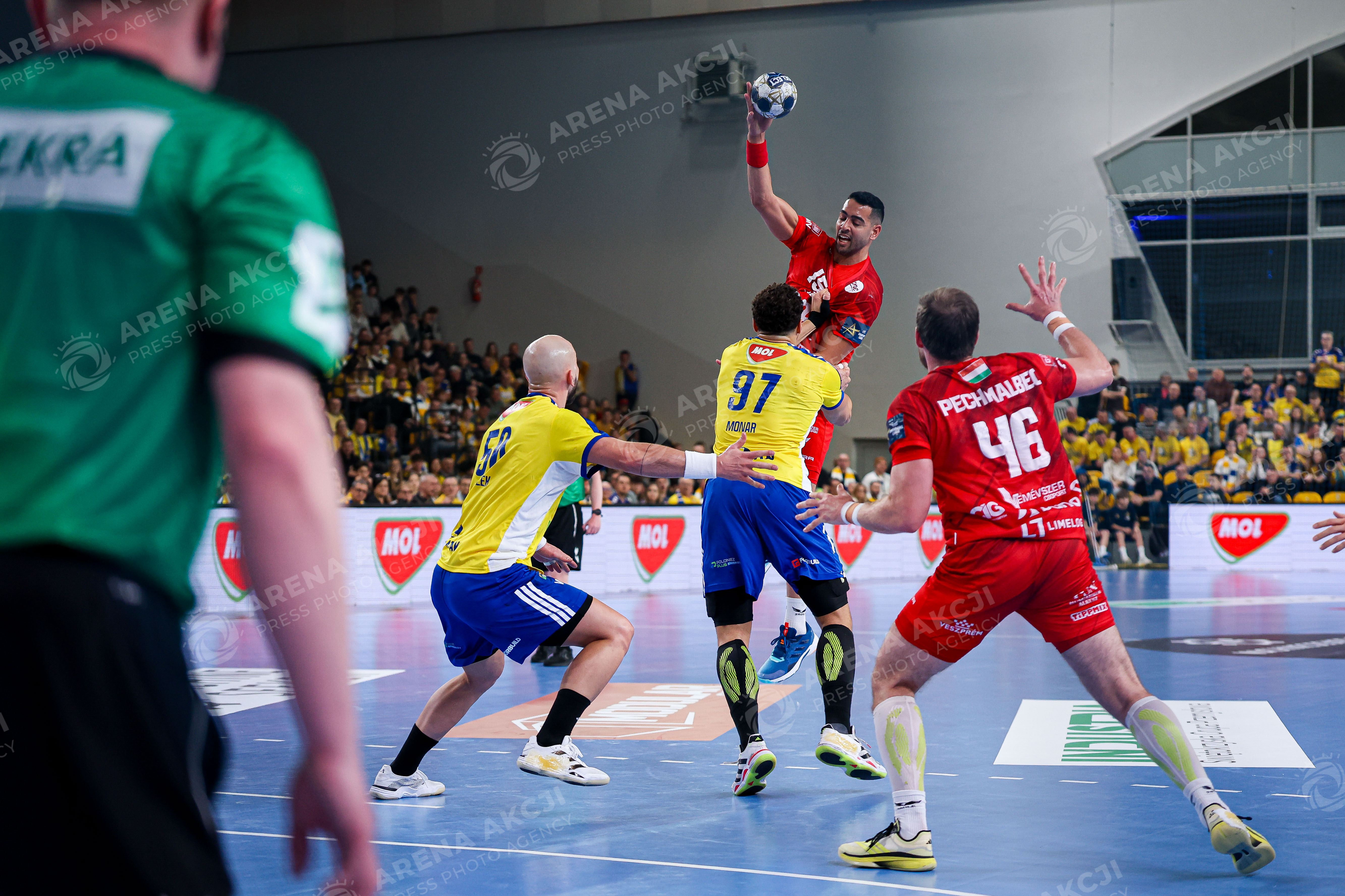 Kielce 19.02.2026. Pilka reczna EHF Liga Mistrzow sezon 2025/2026 kolejka 11 mecz: Industria Kielce - One Veszprem --- Handball EHF Champions League season 2025/2026 round 11 match between Industria Kielce and One Veszprem at Hala Legionow in Kielce, Poland Ahmed Hesham Elsayed Moham Theo Monar Fot. Igor Jakubowski / Arena Akcji