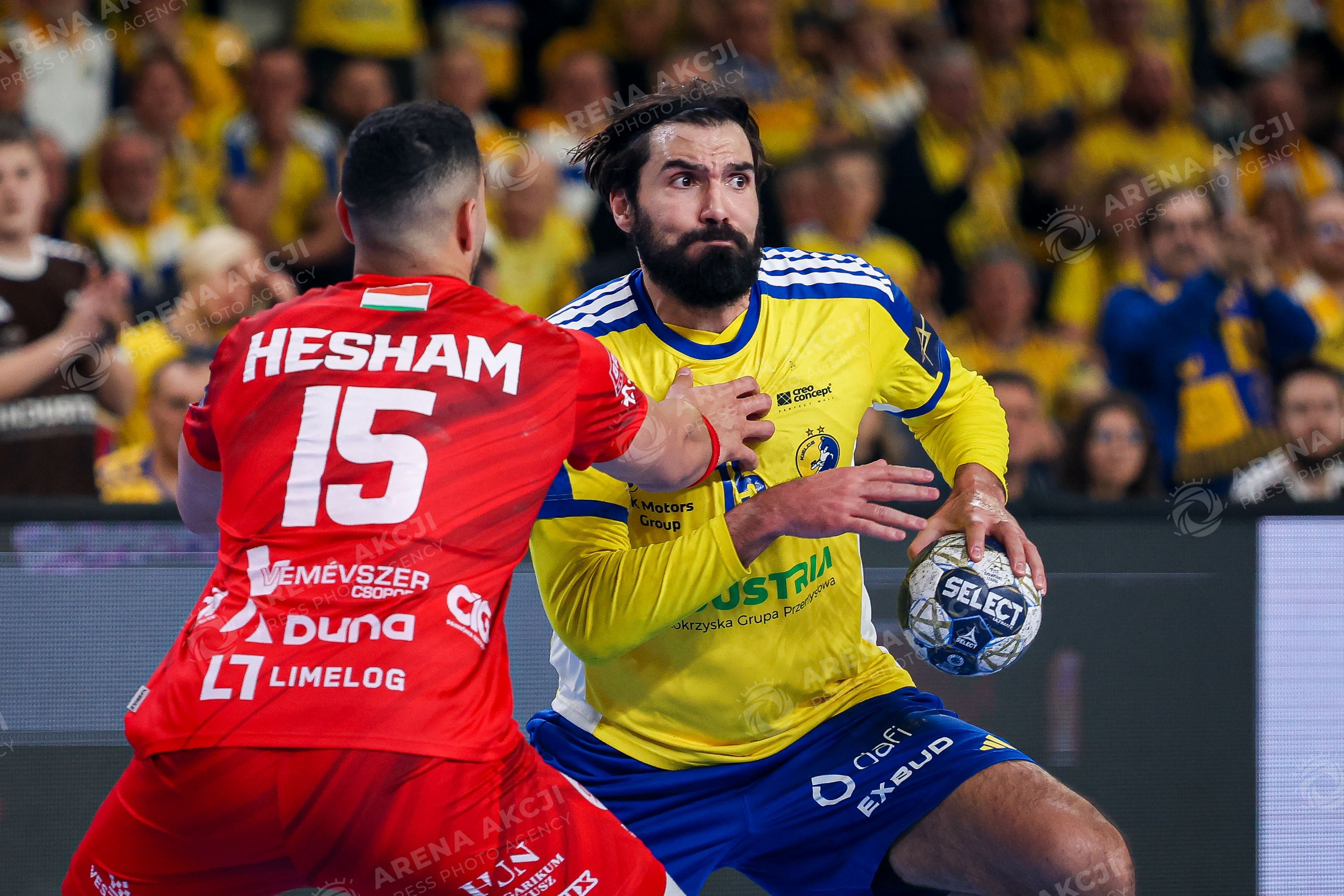 Kielce 19.02.2026. Pilka reczna EHF Liga Mistrzow sezon 2025/2026 kolejka 11 mecz: Industria Kielce - One Veszprem --- Handball EHF Champions League season 2025/2026 round 11 match between Industria Kielce and One Veszprem at Hala Legionow in Kielce, Poland Jorge Maqueda Ahmed Hesham Elsayed Moham Fot. Igor Jakubowski / Arena Akcji
