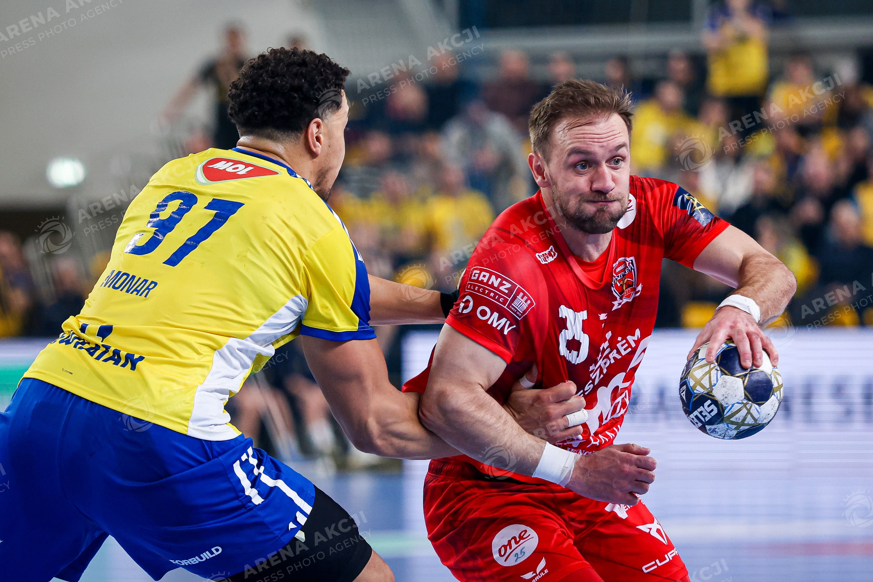 Kielce 19.02.2026. Pilka reczna EHF Liga Mistrzow sezon 2025/2026 kolejka 11 mecz: Industria Kielce - One Veszprem --- Handball EHF Champions League season 2025/2026 round 11 match between Industria Kielce and One Veszprem at Hala Legionow in Kielce, Poland Luka Cindric Theo Monar Fot. Igor Jakubowski / Arena Akcji