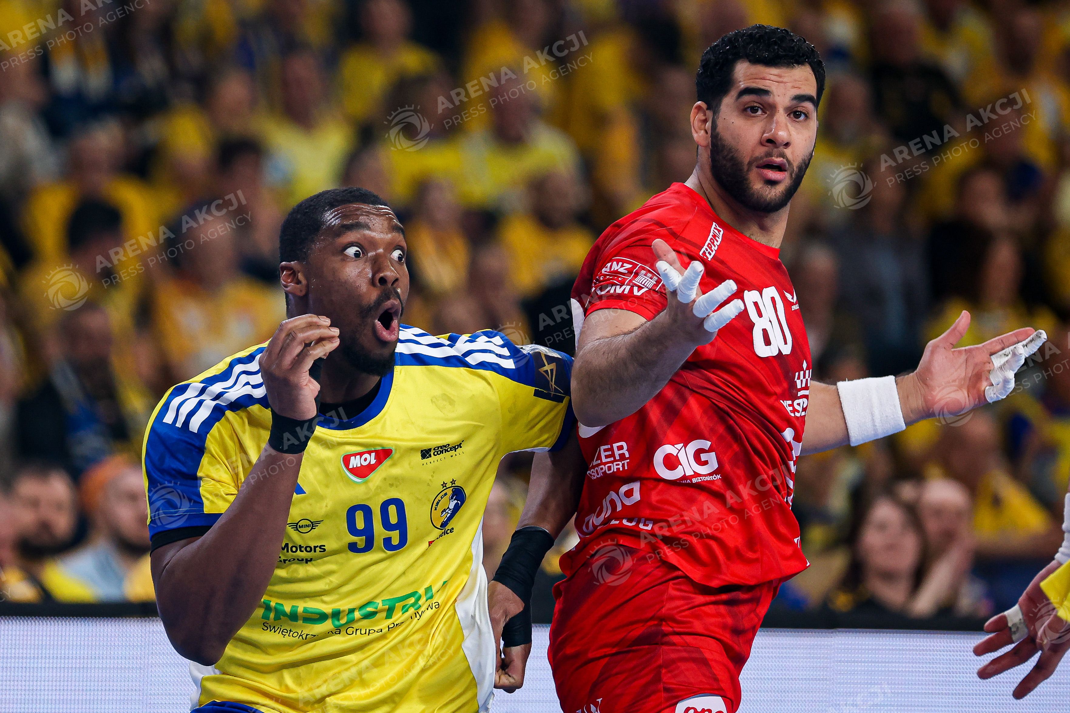 Kielce 19.02.2026. Pilka reczna EHF Liga Mistrzow sezon 2025/2026 kolejka 11 mecz: Industria Kielce - One Veszprem --- Handball EHF Champions League season 2025/2026 round 11 match between Industria Kielce and One Veszprem at Hala Legionow in Kielce, Poland Dylan Nahi Ahmed Adel Mesilhy Fot. Igor Jakubowski / Arena Akcji