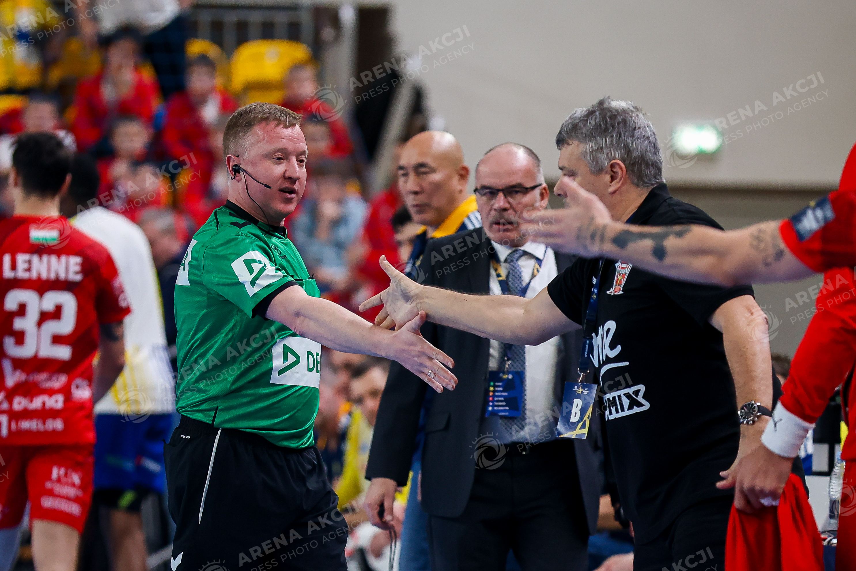Kielce 19.02.2026. Pilka reczna EHF Liga Mistrzow sezon 2025/2026 kolejka 11 mecz: Industria Kielce - One Veszprem --- Handball EHF Champions League season 2025/2026 round 11 match between Industria Kielce and One Veszprem at Hala Legionow in Kielce, Poland sedzia referee Fot. Igor Jakubowski / Arena Akcji