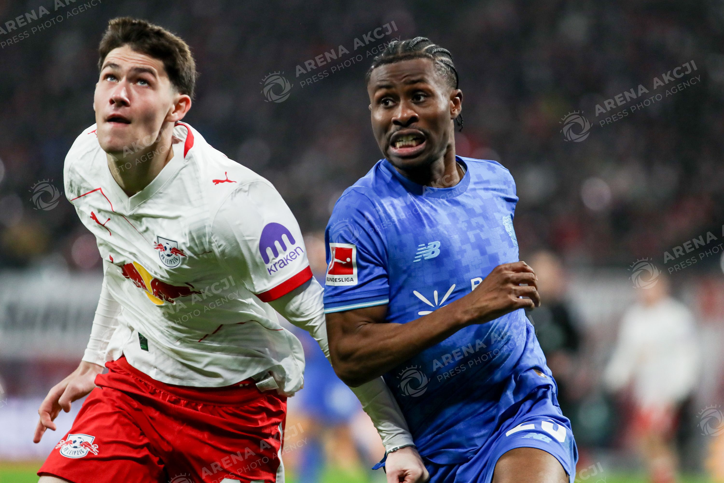 Lipsk 20.12.2025. Pilka nozna Bundesliga sezon 2025/2026 kolejka 15 mecz: RB Lipsk - Bayer Leverkusen --- Football Bundesliga season 2025/2026 round 15 match: RB Leipzig - Bayer Leverkusen nz Nathan Tella Andrija Maksimovic Fot. Kacper Staniec / Arena Akcji
