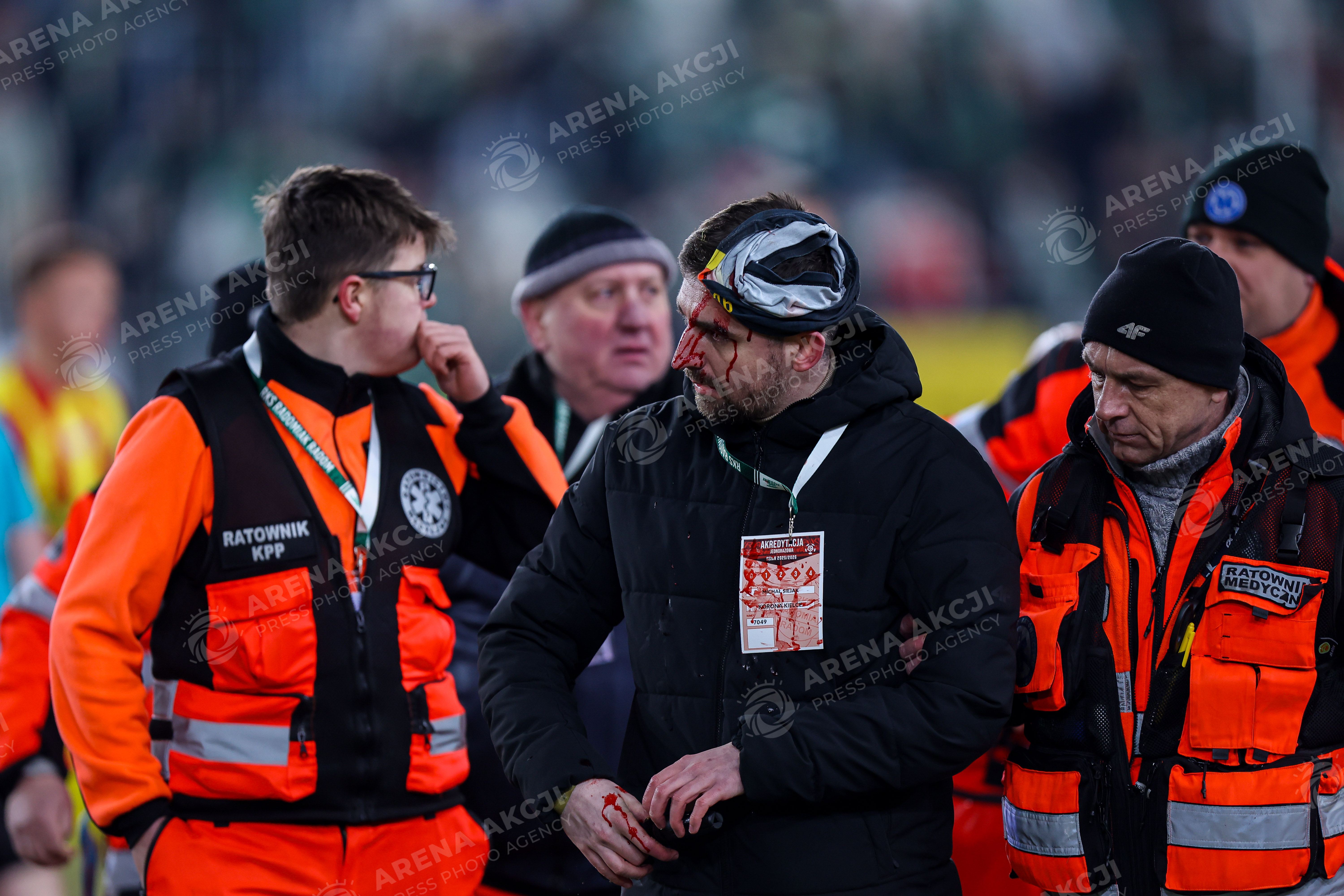 Radom 13.02.2026. Pilka nozna PKO BP Ekstraklasa sezon 2025/2026 kolejka 21 mecz: Radomiak Radom - Korona Kielce --- Football PKO BP Ekstraklasa season 2025/2026 round 21 match: Radomiak Radom - Korona Kielce nz Michal Siejak bijatyka zadyma klotnia rozroba Fot. Igor Jakubowski / Arena Akcji