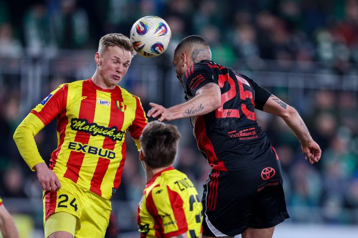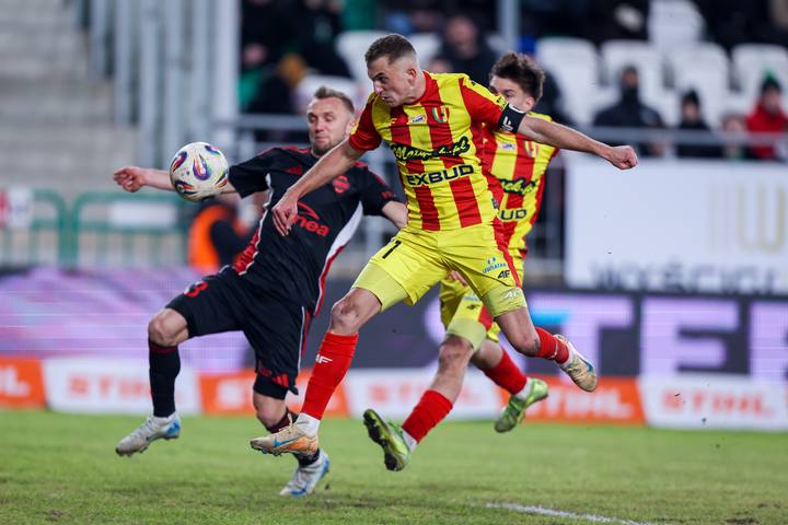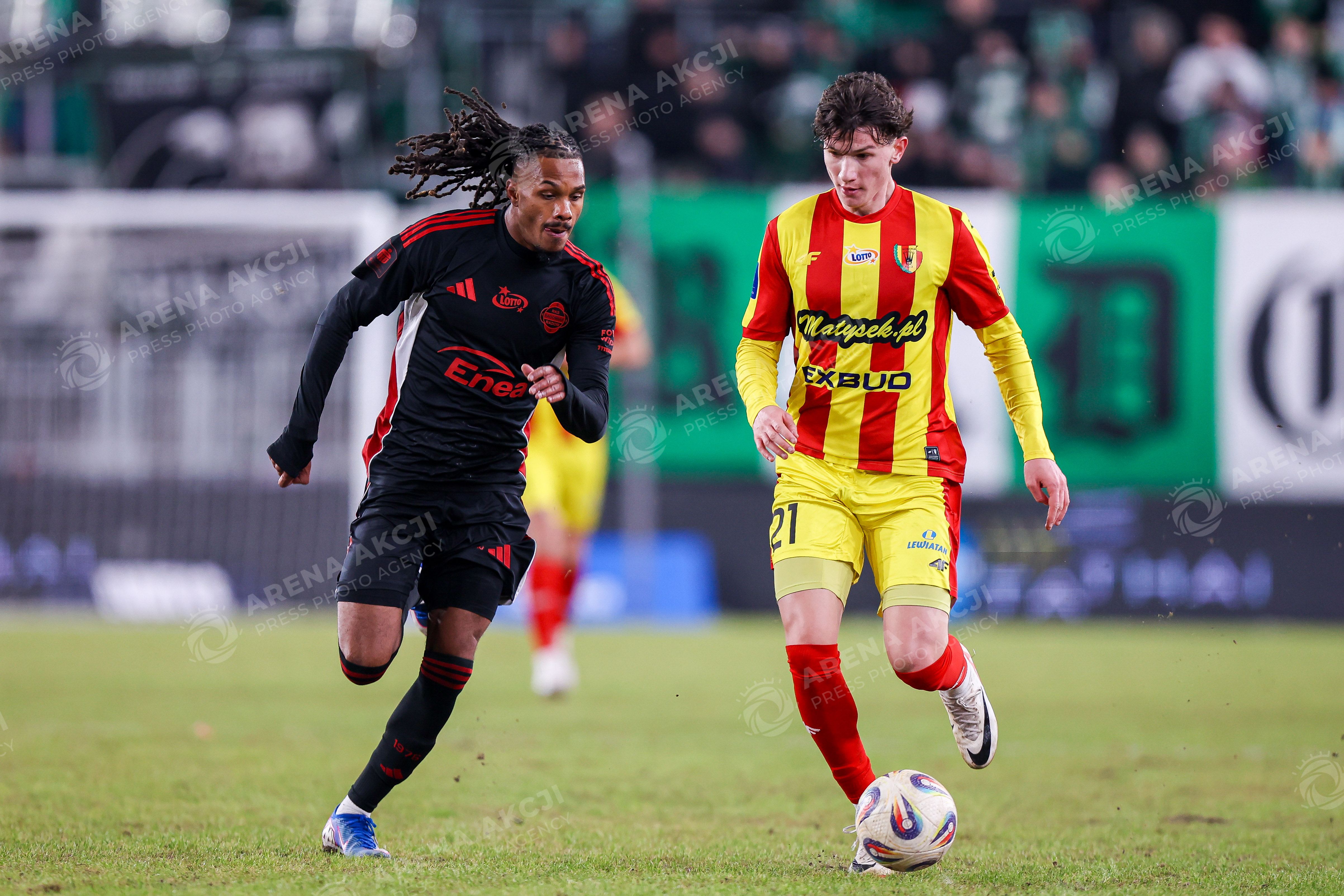 Radom 13.02.2026. Pilka nozna PKO BP Ekstraklasa sezon 2025/2026 kolejka 21 mecz: Radomiak Radom - Korona Kielce --- Football PKO BP Ekstraklasa season 2025/2026 round 21 match: Radomiak Radom - Korona Kielce nz Vasco Lopes Konrad Ciszek Fot. Igor Jakubowski / Arena Akcji