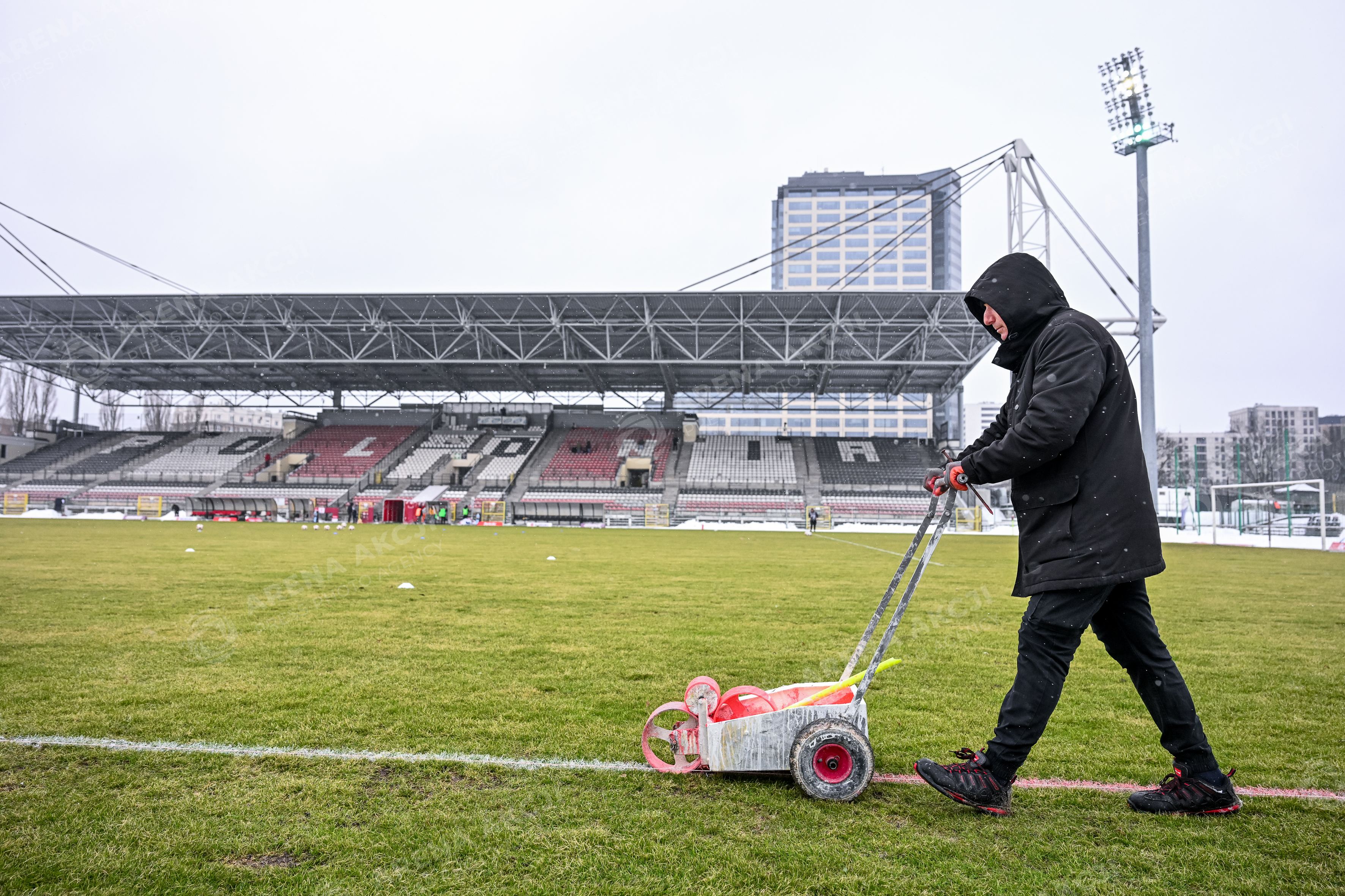 Warszawa 08.02.2026. Pilka nozna Betclic I Liga sezon 2025/2026 kolejka 20 mecz: Polonia Warszawa - Stal Mielec --- Football Betclic I League season 2025/2026 round 20 match: Polonia Warsaw - Stal Mielec nz MALOWANIE CZERWONYCH POMARANCZOWYCH LINI Fot. Igor Jakubowski / Arena Akcji