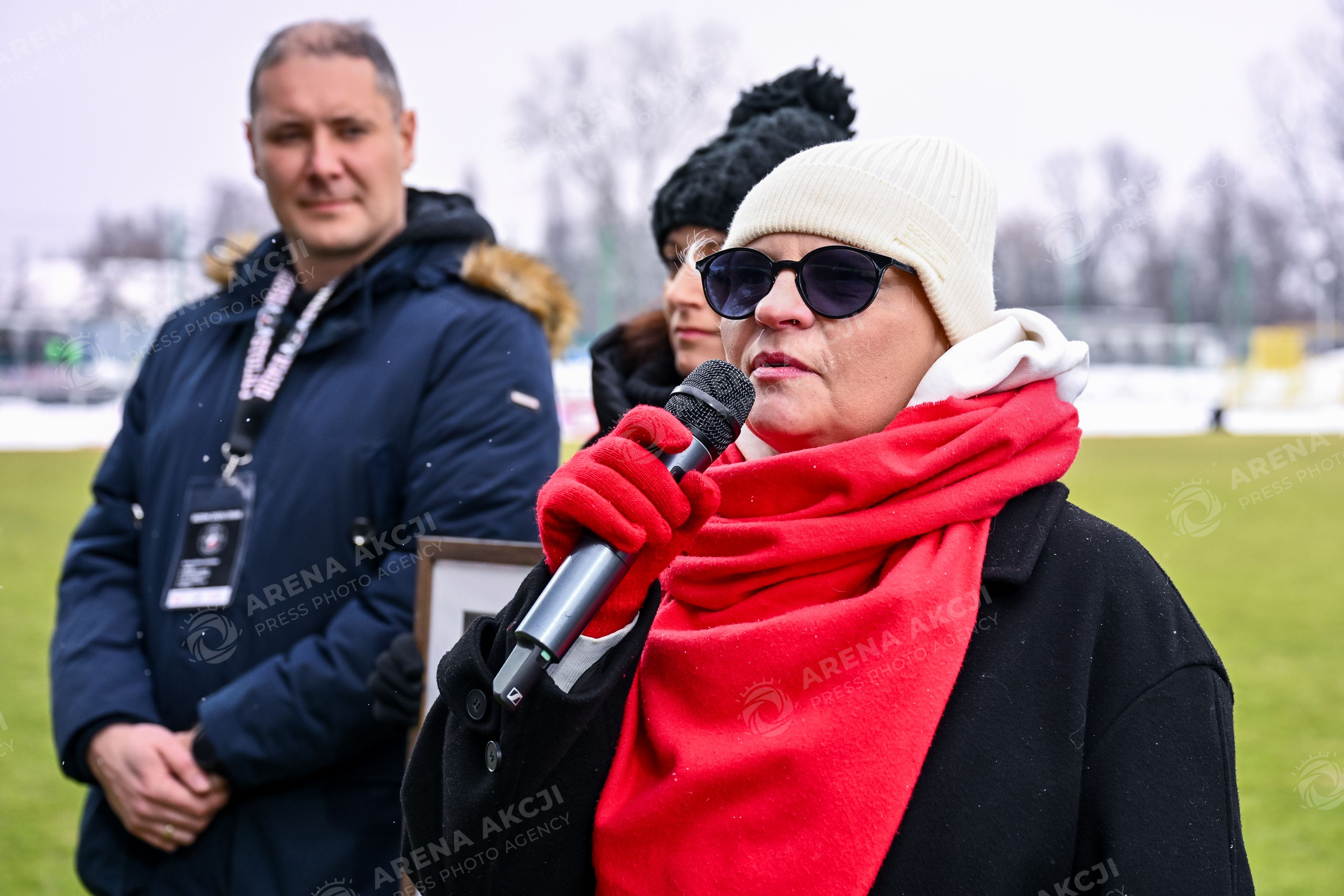 Warszawa 08.02.2026. Pilka nozna Betclic I Liga sezon 2025/2026 kolejka 20 mecz: Polonia Warszawa - Stal Mielec --- Football Betclic I League season 2025/2026 round 20 match: Polonia Warsaw - Stal Mielec nz PAMIATKOWE ZDJECIE ZE SZTANDAREM POLONII WARSZAWA Fot. Igor Jakubowski / Arena Akcji