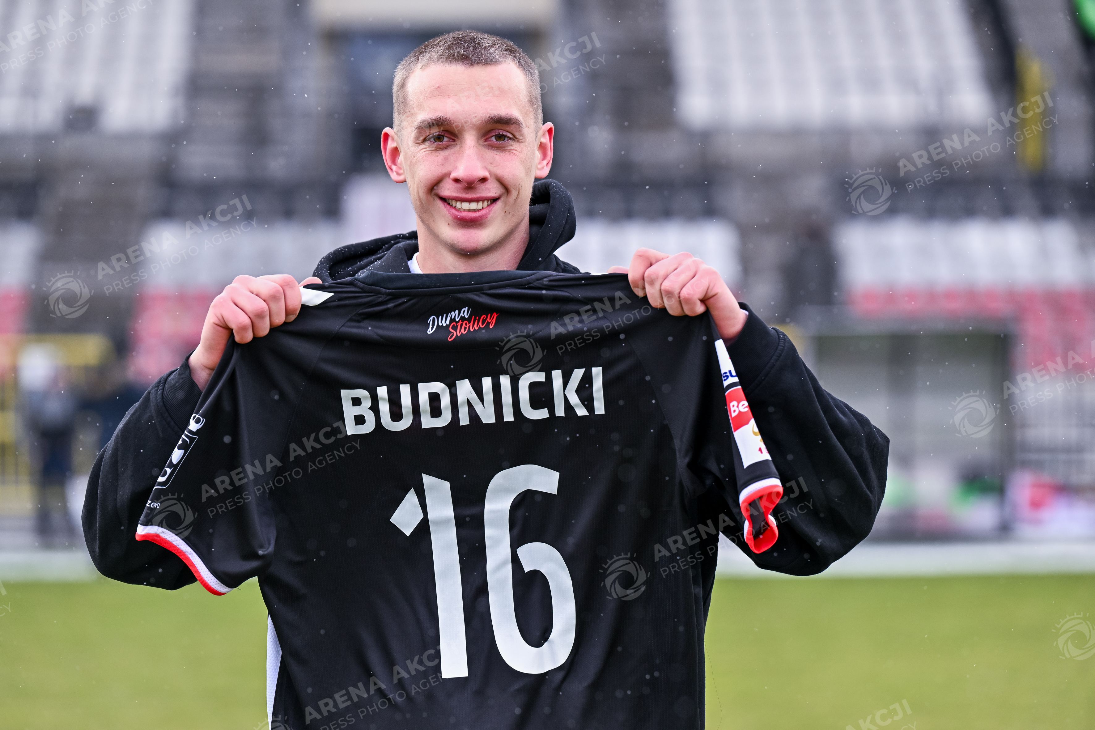 Warszawa 08.02.2026. Pilka nozna Betclic I Liga sezon 2025/2026 kolejka 20 mecz: Polonia Warszawa - Stal Mielec --- Football Betclic I League season 2025/2026 round 20 match: Polonia Warsaw - Stal Mielec nz JAKUB BUDNICKI NOWY PILKARZ POLONII CZARNYCH KOSZUL Fot. Igor Jakubowski / Arena Akcji