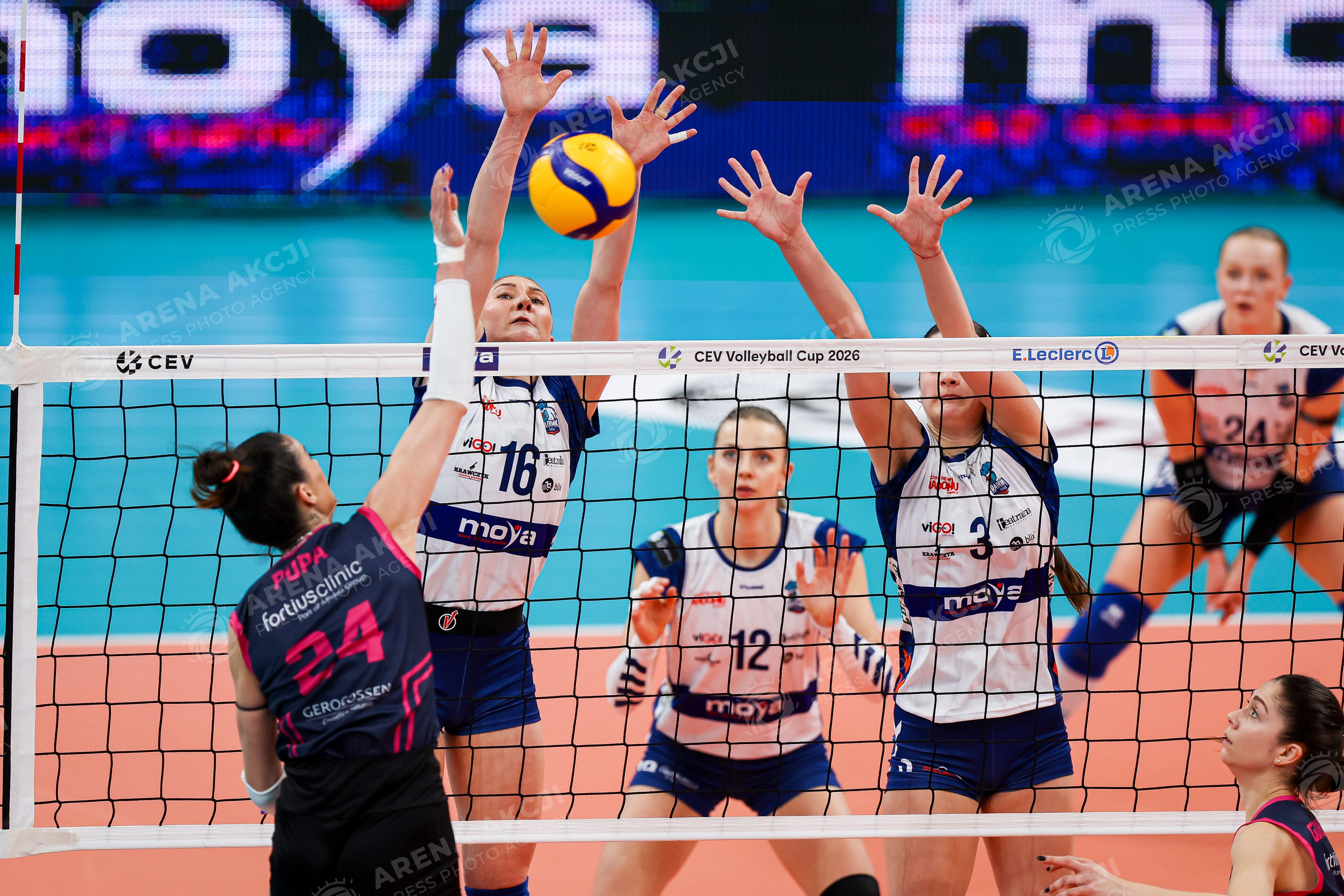 Radom 27.01.2026. Women Volleyball season 2025/2026 CEV Cup match : Radomka Radom - CSO Voluntari --- Siatkowka kobiet sezon 2025/2026 CEV Cup mecz : Radomka Radom - CSO Voluntari nz Georgiana Popa Brigitta petrenko Kateryna zhylinska Fot. Igor Jakubowski / Arena Akcji