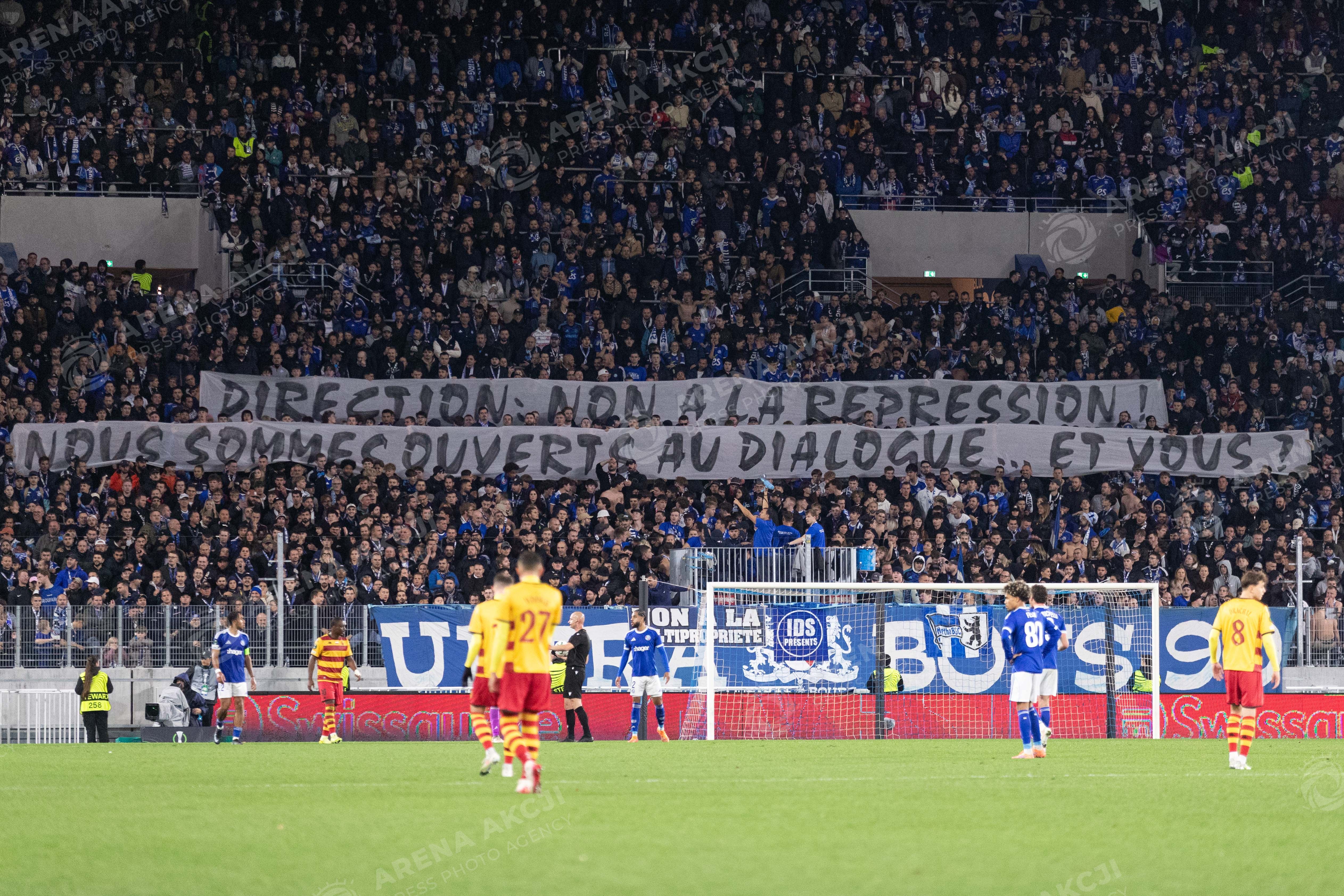 2025.10.23 Strasbourg Liga Konferencji UEFA kolejka 2 sezon 2025/2026 Racing Strasbourg - Jagiellonia Bialystok Nz transparent strasbourg Foto Sathire KELPA / ArenaAkcji 2025.10.23 Strasbourg football UEFA Conference League round 2 season 2025/2026 match Racing Strasbourg - Jagiellonia Bialystok Credit: Sathire KELPA / ArenaAkcji