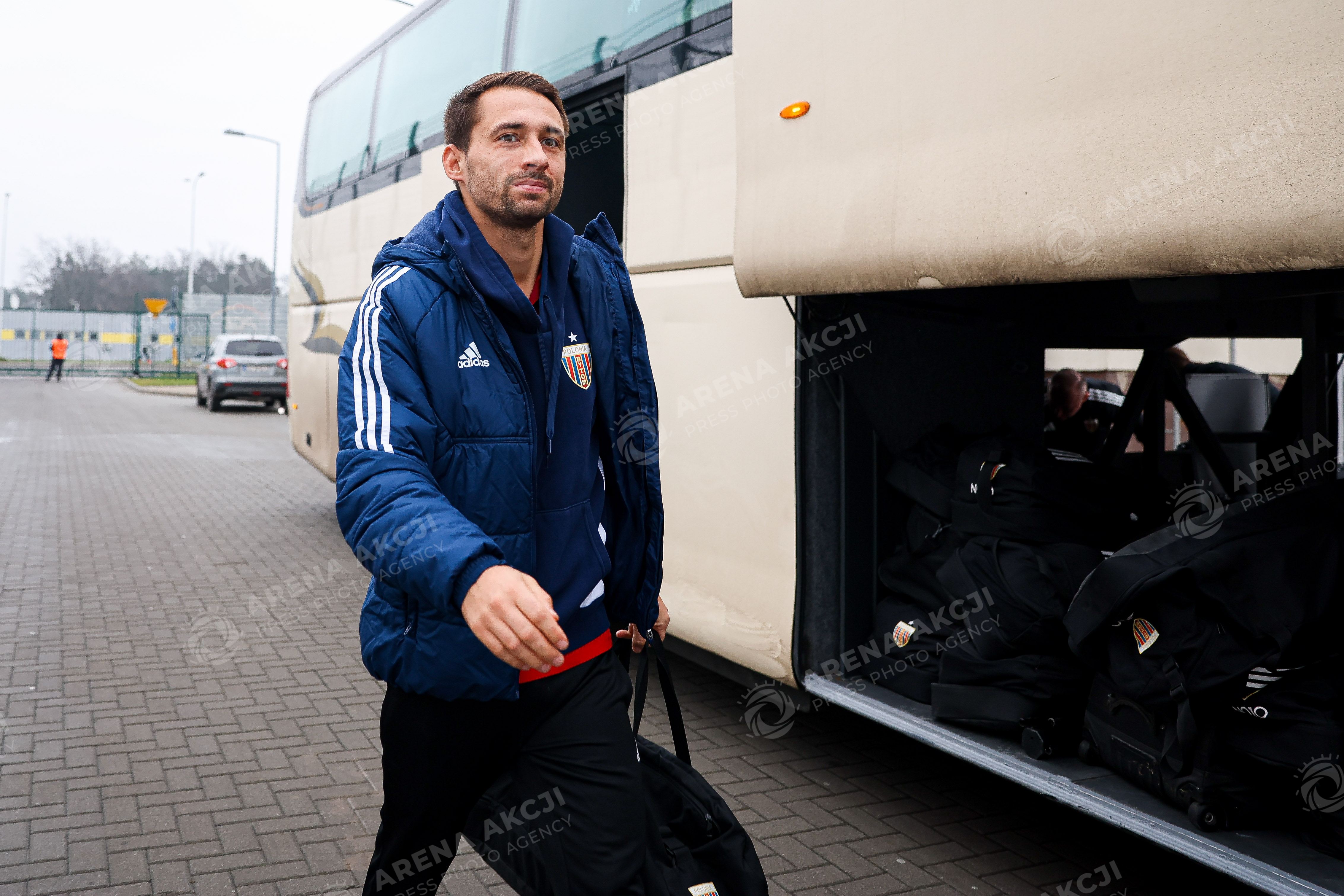 Swidnik 03.12.2025. Pilka nozna STS Puchar Polski sezon 2025/2026 1/8 finalu mecz: Avia Swidnik - Polonia Bytom --- Football STS Polish Cup season 2025/2026 1/8 final match: Avia Swidnik - Polonia Bytom nz wyjscie zawodnikow z autokaru Fot. Igor Jakubowski / Arena Akcji
