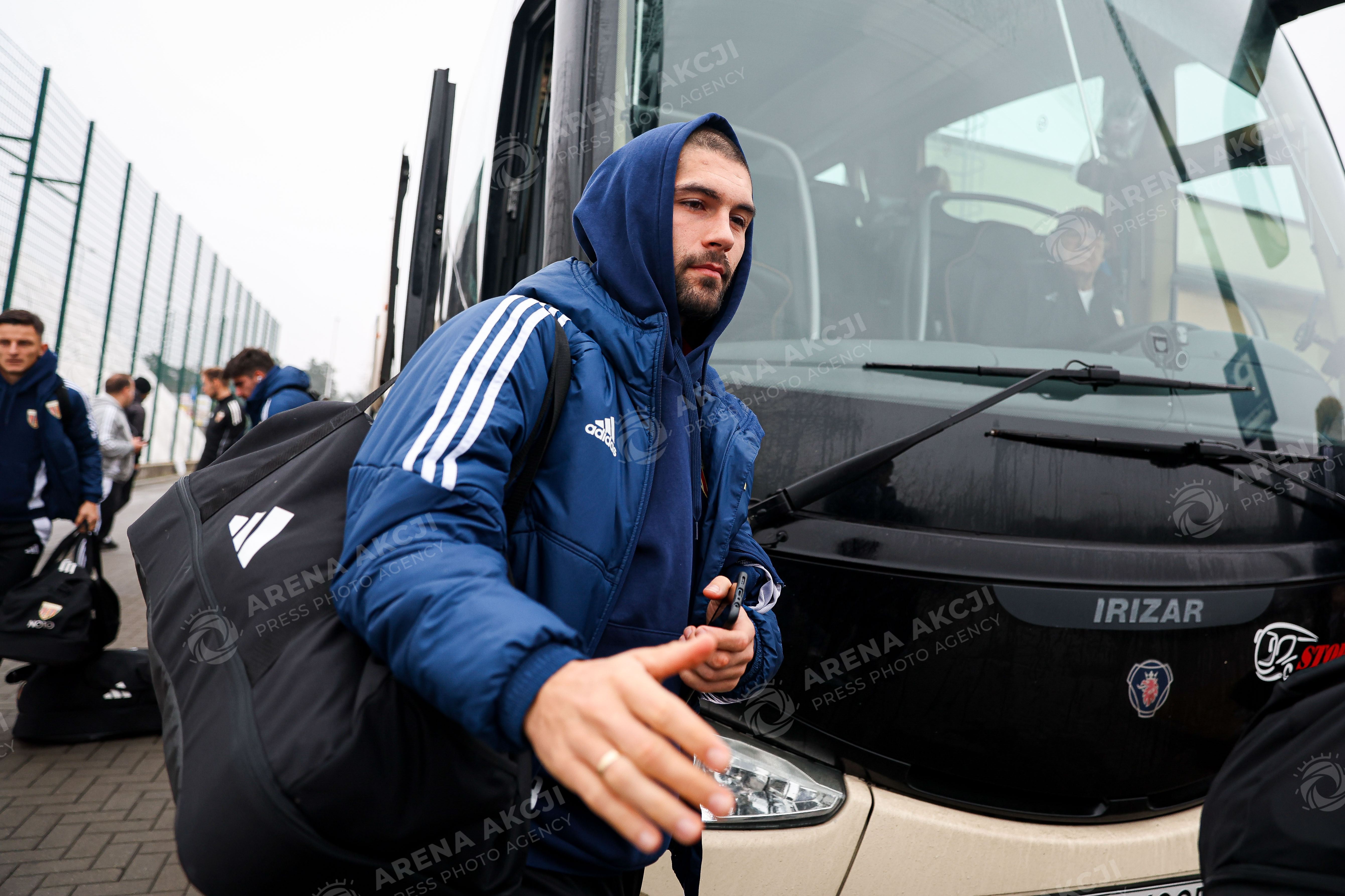 Swidnik 03.12.2025. Pilka nozna STS Puchar Polski sezon 2025/2026 1/8 finalu mecz: Avia Swidnik - Polonia Bytom --- Football STS Polish Cup season 2025/2026 1/8 final match: Avia Swidnik - Polonia Bytom nz wyjscie zawodnikow z autokaru Fot. Igor Jakubowski / Arena Akcji