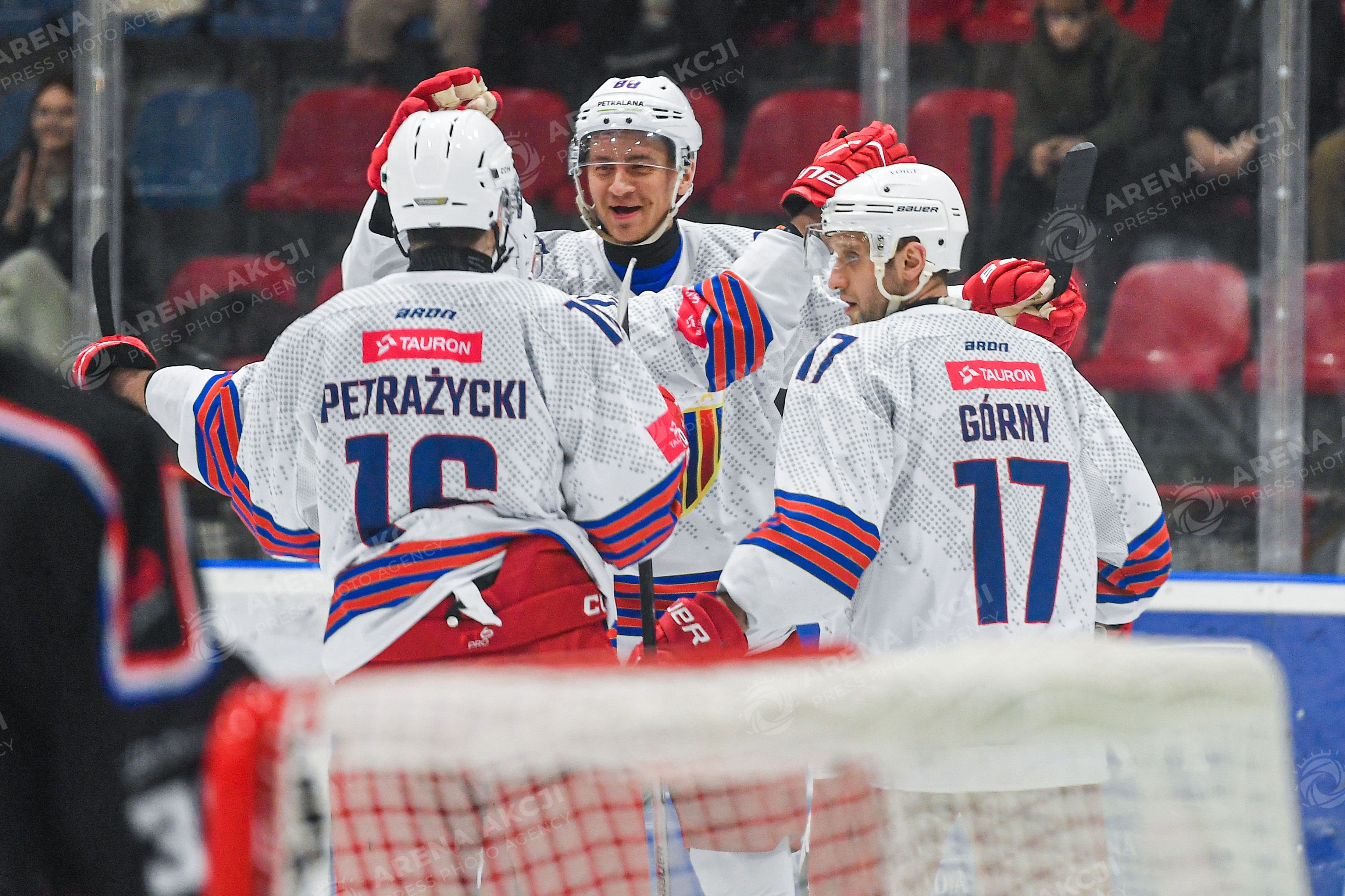 Bytom 11.01.2026. Hokej na lodzie Tauron Hokej Liga sezon 2025/2026 kolejka 34 mecz: Polonia Bytom - KH Sanok --- Ice Hockey Polish Hockey League season 2025/2026 round 34 match: Polonia Bytom - KH Sanok nz Tymoteusz Petrazycki, Dmitry Zalamay, Kamil Gorny Fot. Igor Jakubowski / Arena Akcji