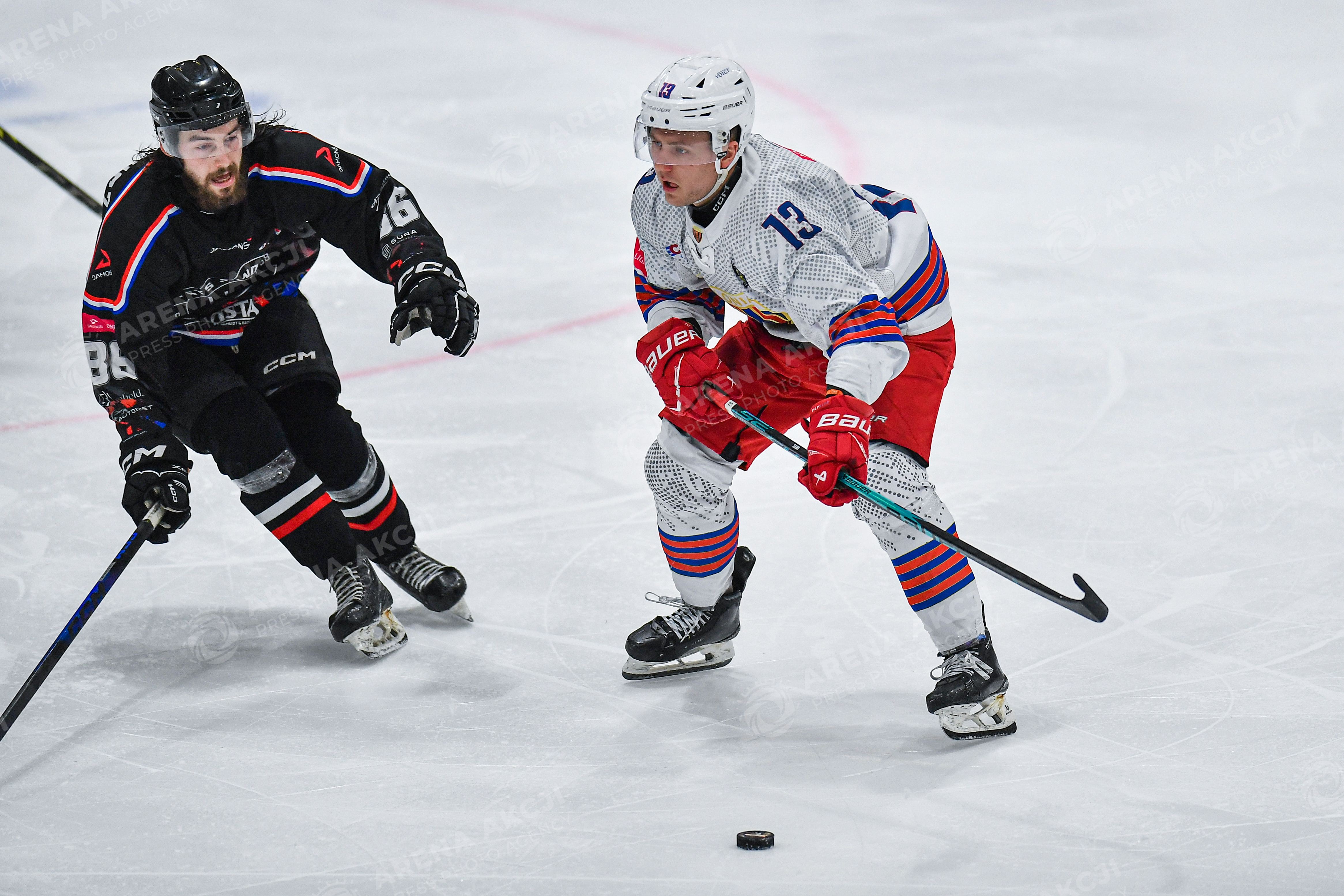 Bytom 11.01.2026. Hokej na lodzie Tauron Hokej Liga sezon 2025/2026 kolejka 34 mecz: Polonia Bytom - KH Sanok --- Ice Hockey Polish Hockey League season 2025/2026 round 34 match: Polonia Bytom - KH Sanok nz Filip Sienkiewicz, Radoslaw Sawicki Fot. Igor Jakubowski / Arena Akcji