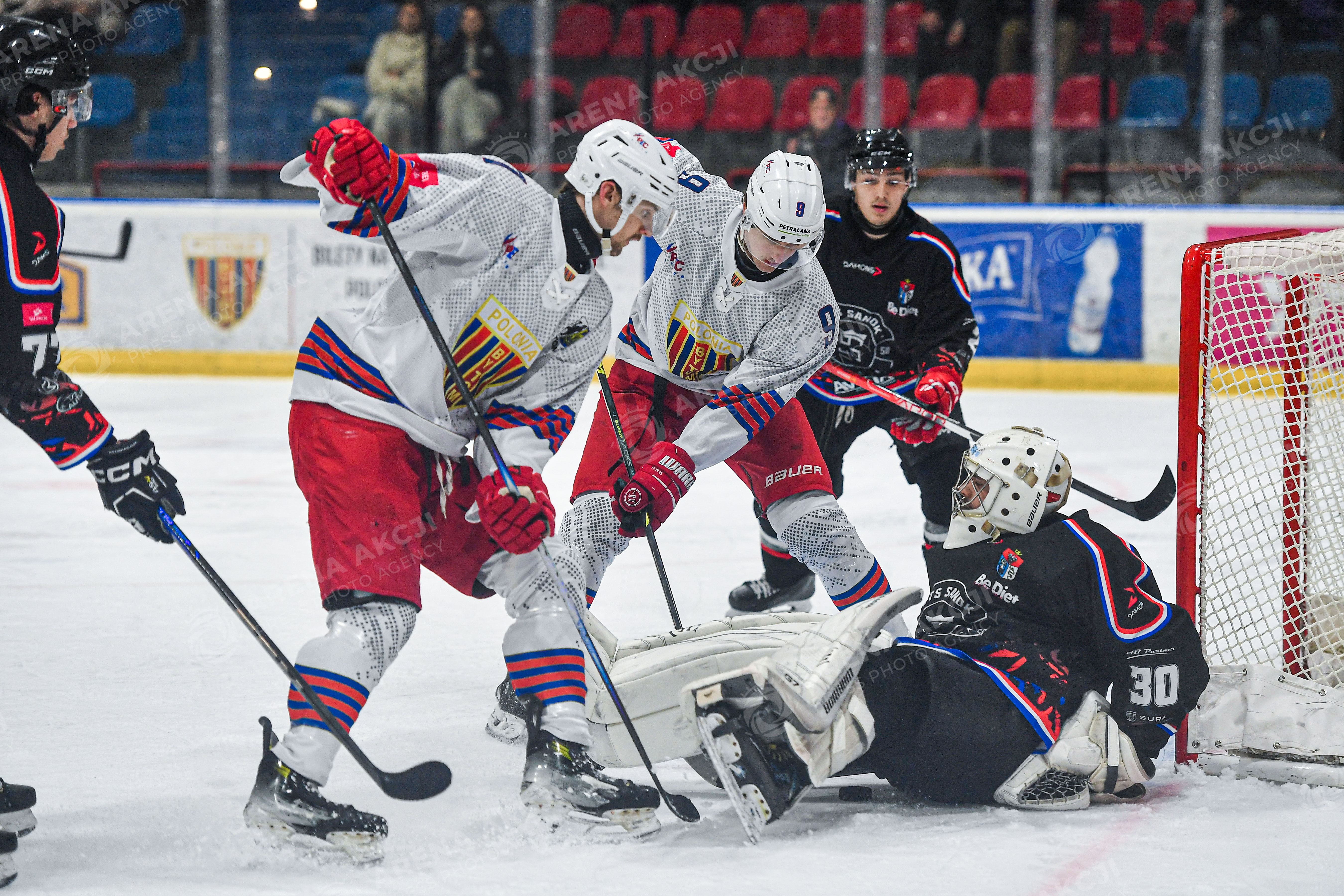 Bytom 11.01.2026. Hokej na lodzie Tauron Hokej Liga sezon 2025/2026 kolejka 34 mecz: Polonia Bytom - KH Sanok --- Ice Hockey Polish Hockey League season 2025/2026 round 34 match: Polonia Bytom - KH Sanok nz Dominik Jarosz, Dominik Buczek Fot. Igor Jakubowski / Arena Akcji