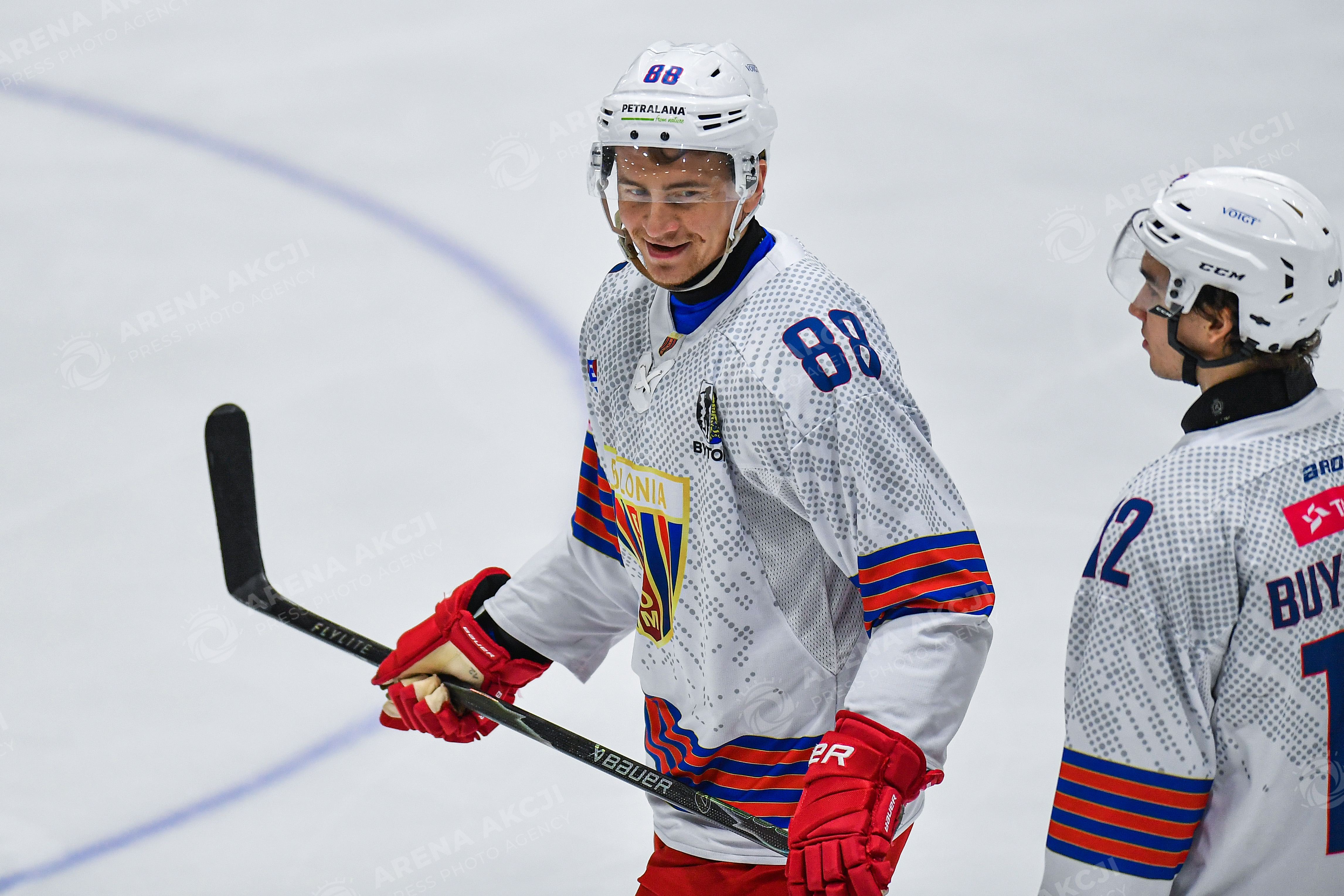 Bytom 11.01.2026. Hokej na lodzie Tauron Hokej Liga sezon 2025/2026 kolejka 34 mecz: Polonia Bytom - KH Sanok --- Ice Hockey Polish Hockey League season 2025/2026 round 34 match: Polonia Bytom - KH Sanok nz Dmitry Zalamay, Andrey Buyalskiy Fot. Igor Jakubowski / Arena Akcji