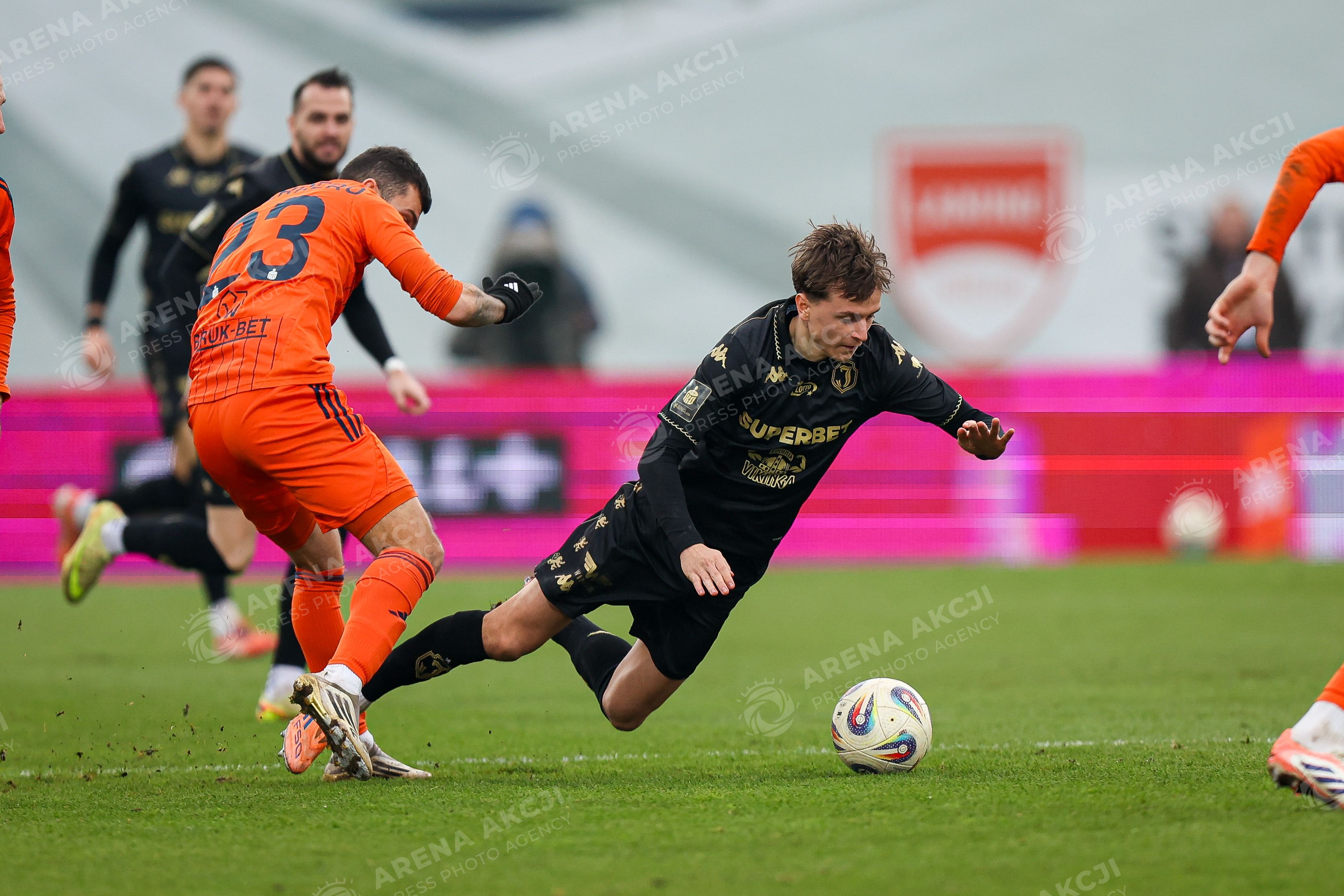 Nieciecza 07.12.2025. Pilka nozna PKO BP Ekstraklasa sezon 2025/2026 kolejka 18 mecz: Bruk - Bet Termalica Nieciecza - Jagiellonia Bialystok --- Football PKO BP Ekstraklasa season 2025/2026 round 18 match: Bruk - Bet Termalica Nieciecza - Jagiellonia Bialystok nz Dawid Drachal Sergio Guerrero Fot. Igor Jakubowski / Arena Akcji