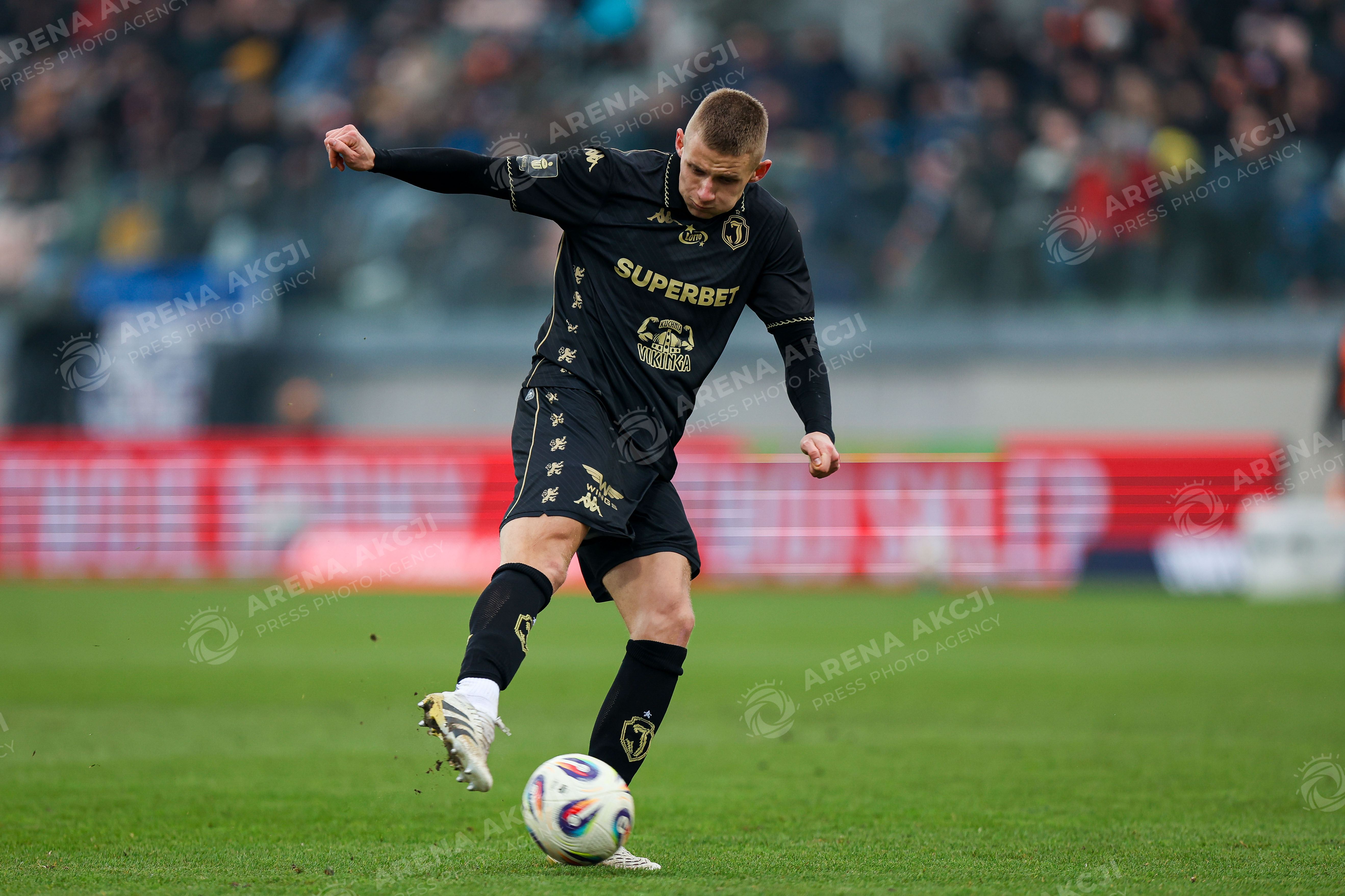 Nieciecza 07.12.2025. Pilka nozna PKO BP Ekstraklasa sezon 2025/2026 kolejka 18 mecz: Bruk - Bet Termalica Nieciecza - Jagiellonia Bialystok --- Football PKO BP Ekstraklasa season 2025/2026 round 18 match: Bruk - Bet Termalica Nieciecza - Jagiellonia Bialystok nz Norbert Wojtuszek strzal Fot. Igor Jakubowski / Arena Akcji