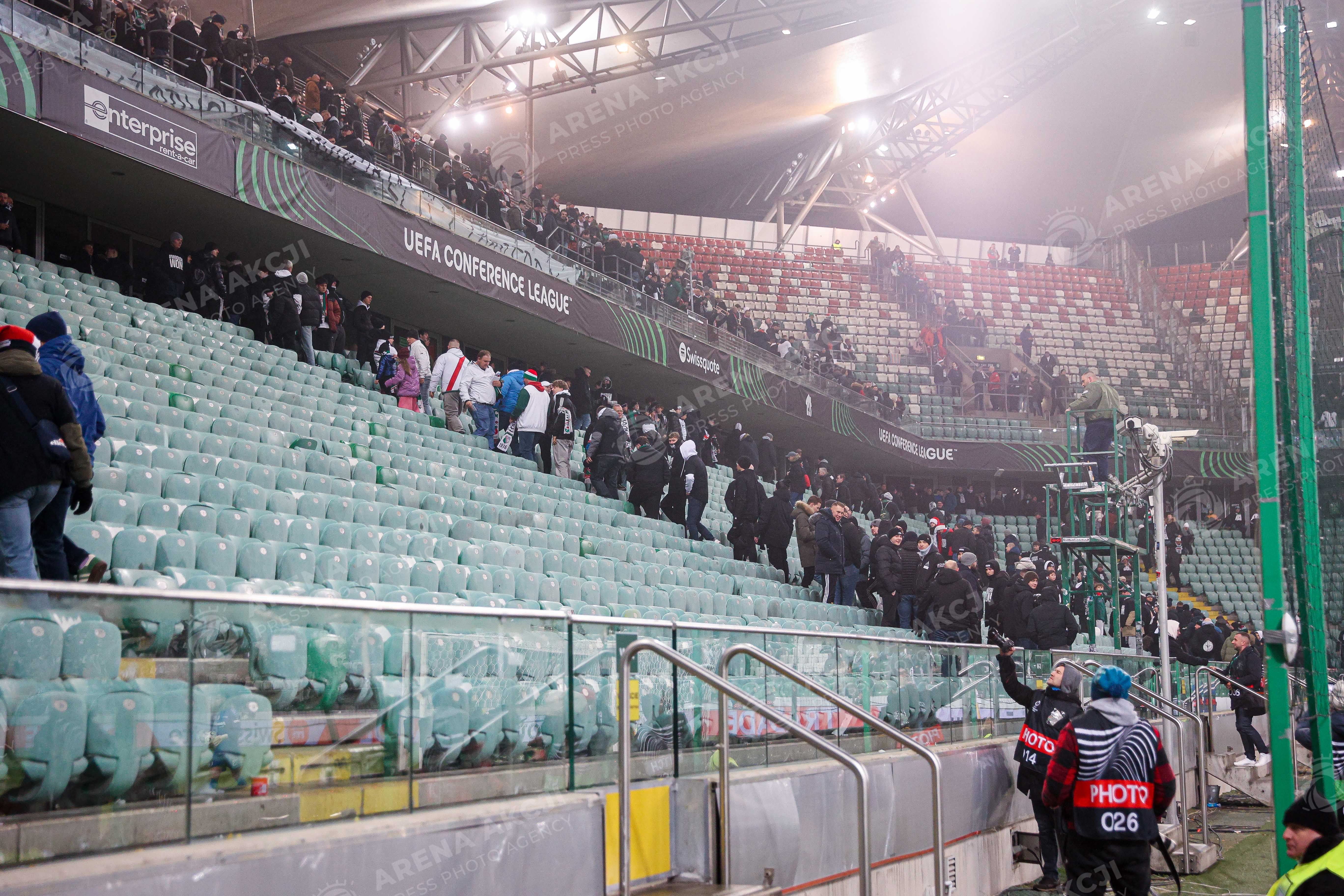 Warszawa 18.12.2025. Pilka nozna Liga Konferencji UEFA sezon 2025/2026 kolejka 6 mecz: Legia Warszawa - Lincoln Red Imps --- Football UEFA Conference League season 2025/2026 round 6 match: Legia Warsaw - Lincoln Red Imps nz kibice wychodza ze stadionu zyleta Fot. Igor Jakubowski / Arena Akcji