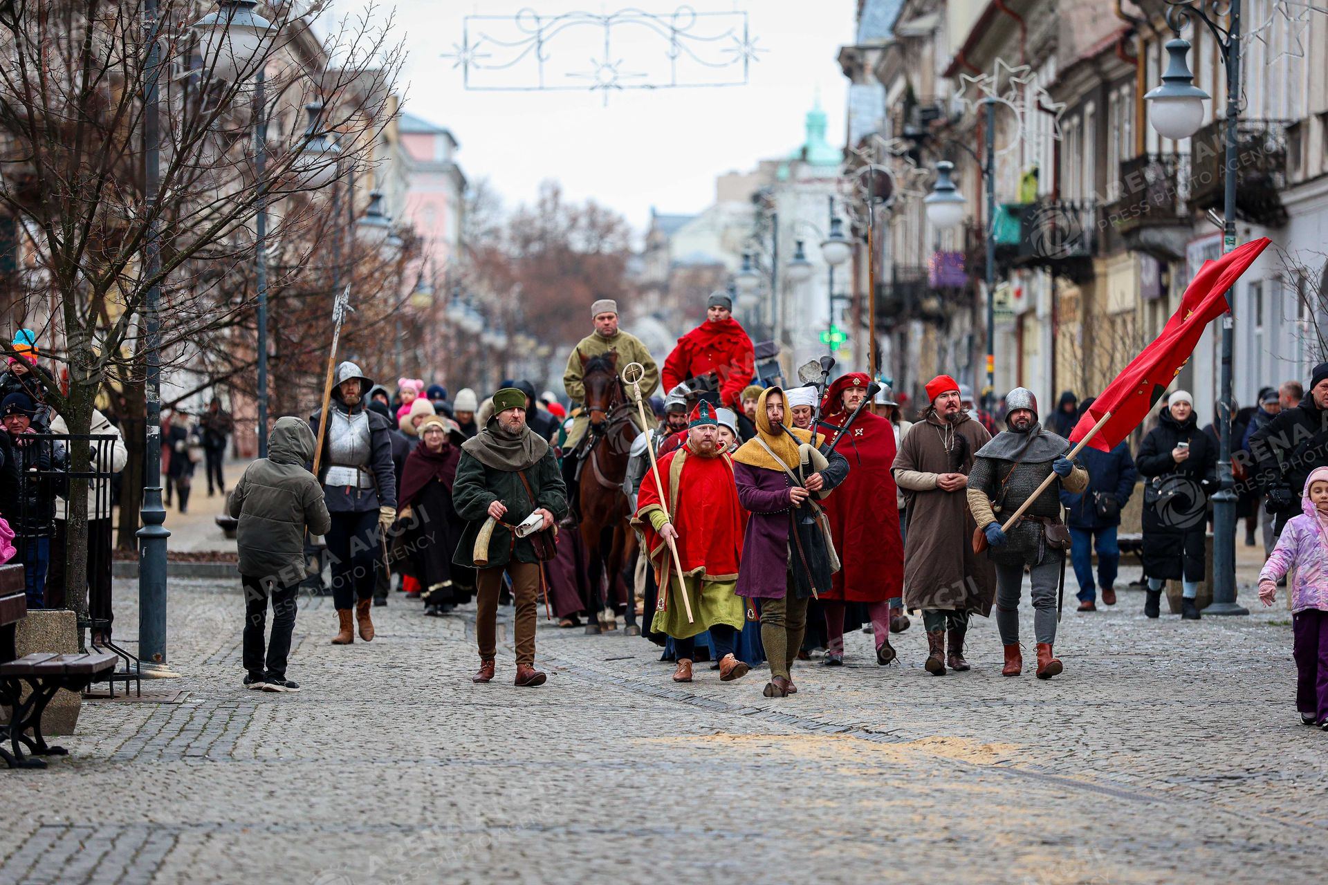 Radom 28.12.2025. Z placu Corazziego wyruszy barwny orszak w sredniowiecznym stylu nawiazujacy do zareczyn Jadwiga Jagiellonka i Jerzy Bogaty w 1474 roku na radomskim zamku. Nastepnie na rynku odbyly sie pokazy rycerskie animacje dla dzieci degustacja strawy dworskiej i inne atrakcje inspirowane historia miasta --- A colorful procession in medieval style set off from Corazzi Square referring to the betrothal of Jadwiga Jagiellonka and George Bogaty in 1474 at Radom Castle Subsequently the Market Square hosted knightly displays childrens animations tastings of courtly cuisine and other attractions inspired by the city history nz Fot. Igor Jakubowski / Arena Akcji
