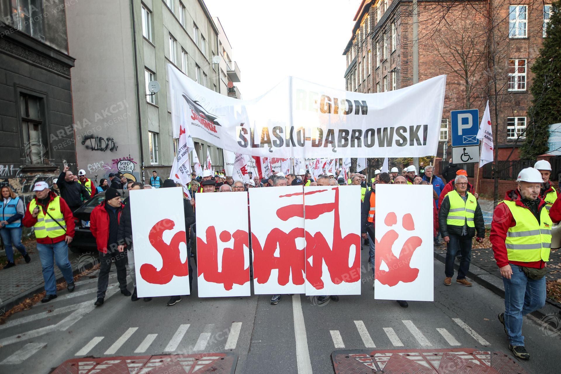 04.11.2025, Katowice Protest Zwiazkow Zawodowych przeciwko polityce rzadu wobec sektora przemyslu - Trade Unions protest against the government's policy towards the industrial sector Nz. Pikieta, protest Fot. Michal Chwieduk/Arena Akcji