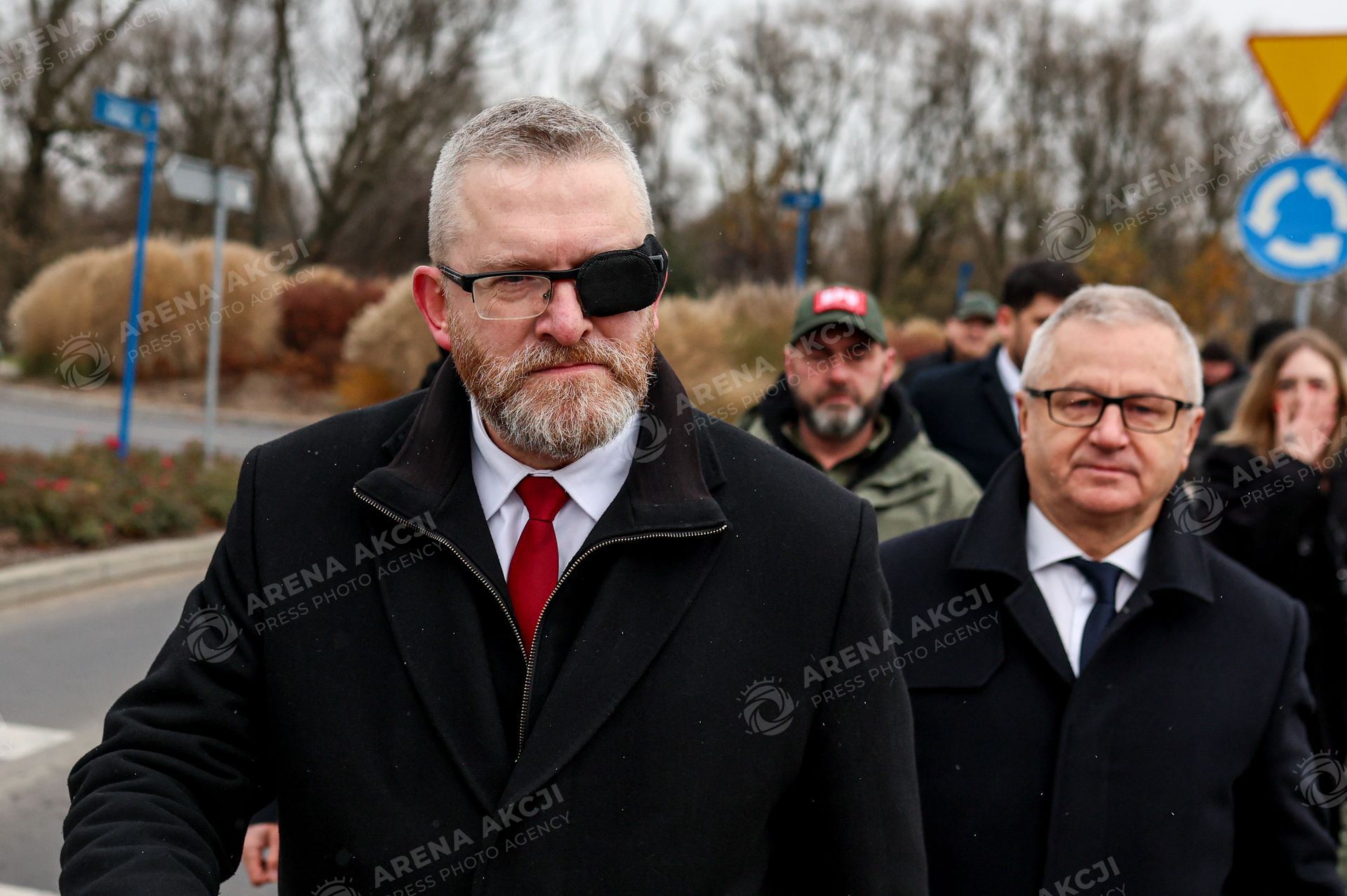 22.11.2025, Oswiecim Konferencja Konfederacji Korony Polskiej nieopodal Muzeum KL Auschwitz - Press conference of a Polish political party Konfederacja Korony Polskiej next to the museum KL Auschwitz Nz. Grzegorz Braun, Wlodzimierz Skalik Fot. Michal Chwieduk/Arena Akcji