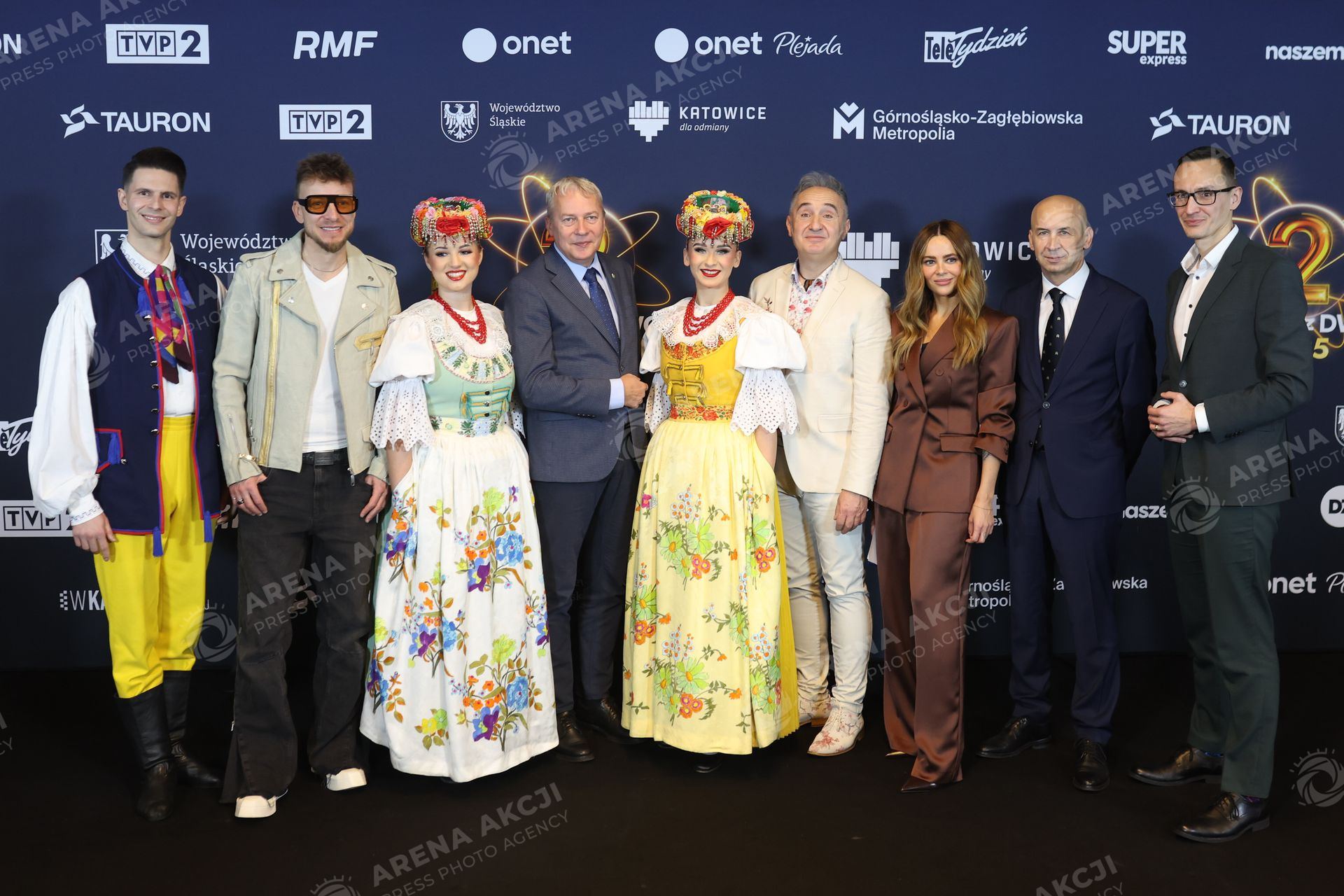 05.12.2025, Katowice Konferencja prasowa przed eventem Sylwester z Dwojka TVP Nz. Piotr Kupicha Zbigniew Cierniak Zespol Slask Wojciech Saliga Gabi Drzewiecka Kazimierz Karolczak Maciej Stachura Fot. Michal Chwieduk/Arena Akcji