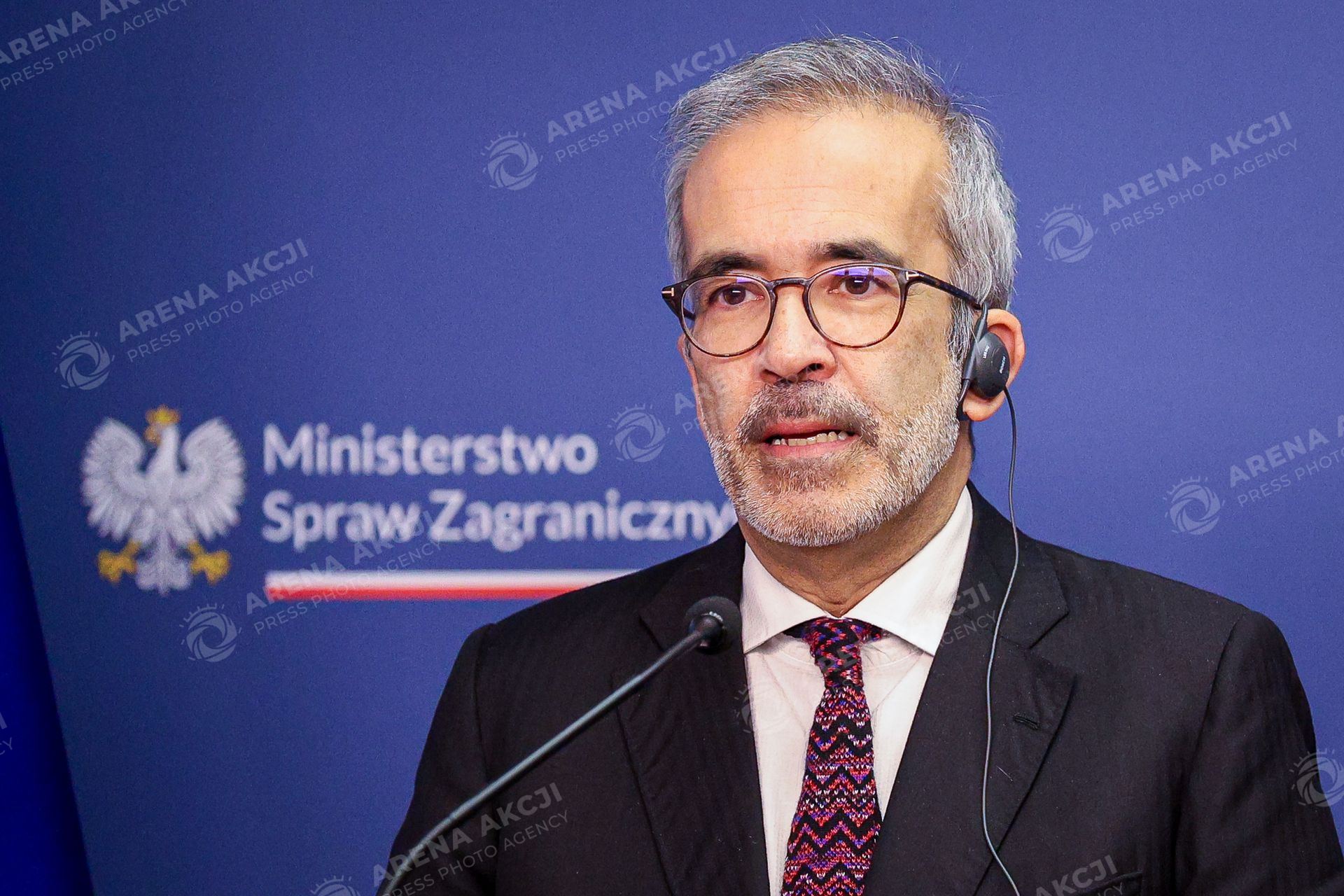 Warszawa 19.12.2025. Ministerstwo Spraw Zagranicznych. Oswiadczenia prasowe szefow dyplomacji Polski i Portugalii Radoslawa Sikorskiego i Paulo Rangela w sprawach Ukrainy i handlu pomiedzy Polska a Portugalia --- Ministry of Foreign Affairs. Press statements by the heads of diplomacy of Poland and Portugal, Radoslaw Sikorski and Paulo Rangel, on matters concerning Ukraine and trade between Poland and Portugal. nz Radoslaw Sikorski Paulo Rangel Fot. Igor Jakubowski / Arena Akcji