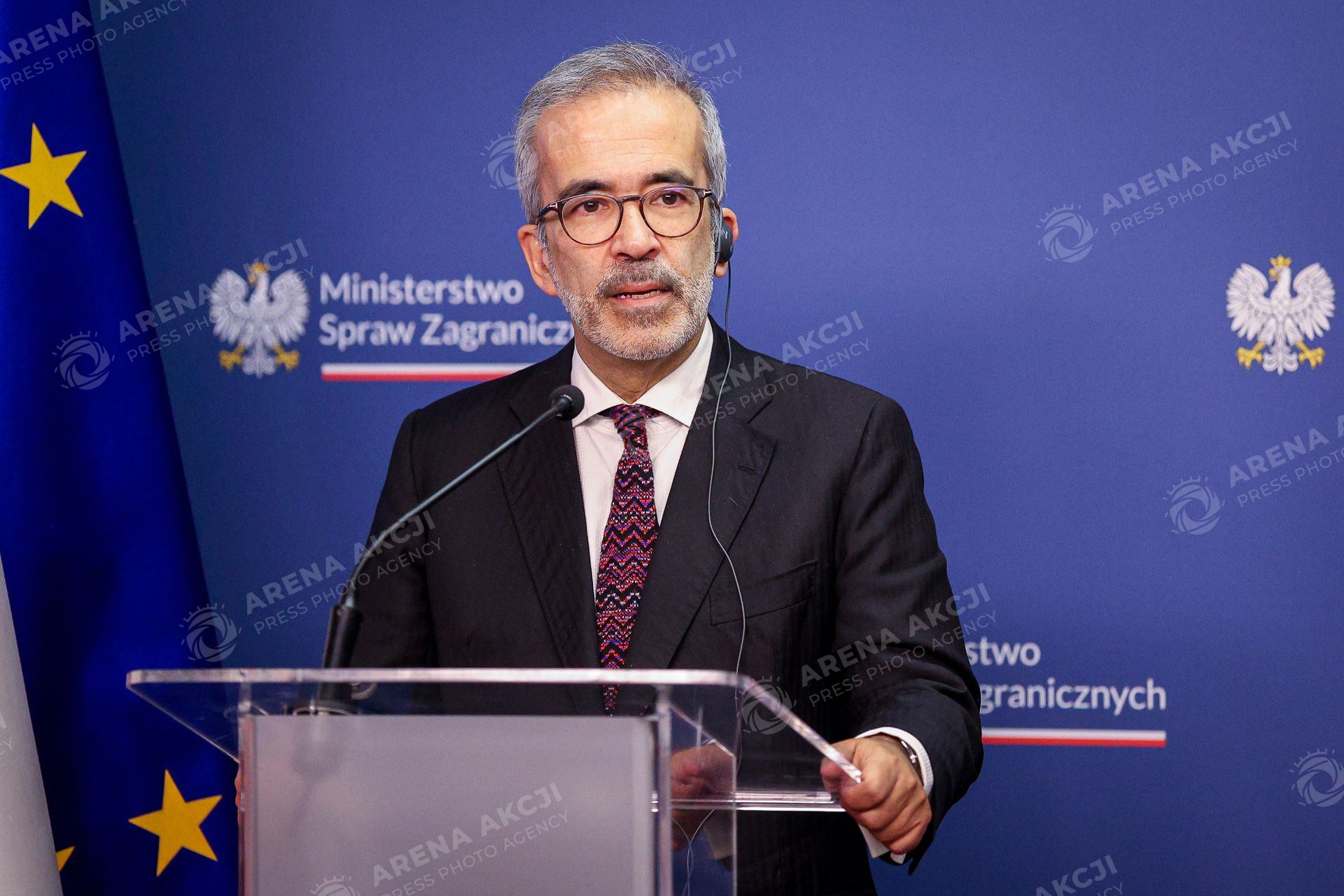 Warszawa 19.12.2025. Ministerstwo Spraw Zagranicznych. Oswiadczenia prasowe szefow dyplomacji Polski i Portugalii Radoslawa Sikorskiego i Paulo Rangela w sprawach Ukrainy i handlu pomiedzy Polska a Portugalia --- Ministry of Foreign Affairs. Press statements by the heads of diplomacy of Poland and Portugal, Radoslaw Sikorski and Paulo Rangel, on matters concerning Ukraine and trade between Poland and Portugal. nz Radoslaw Sikorski Paulo Rangel Fot. Igor Jakubowski / Arena Akcji