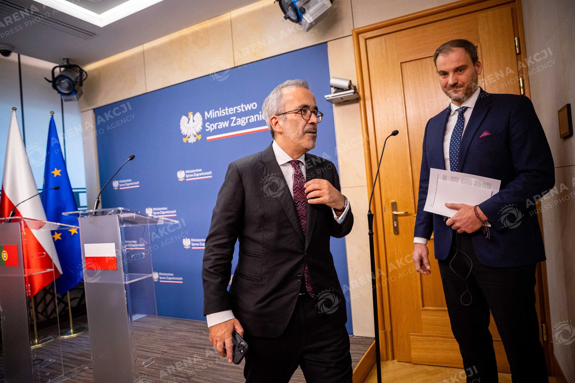 Warszawa 19.12.2025. Ministerstwo Spraw Zagranicznych. Oswiadczenia prasowe szefow dyplomacji Polski i Portugalii Radoslawa Sikorskiego i Paulo Rangela w sprawach Ukrainy i handlu pomiedzy Polska a Portugalia --- Ministry of Foreign Affairs. Press statements by the heads of diplomacy of Poland and Portugal, Radoslaw Sikorski and Paulo Rangel, on matters concerning Ukraine and trade between Poland and Portugal. nz Radoslaw Sikorski Paulo Rangel Fot. Igor Jakubowski / Arena Akcji