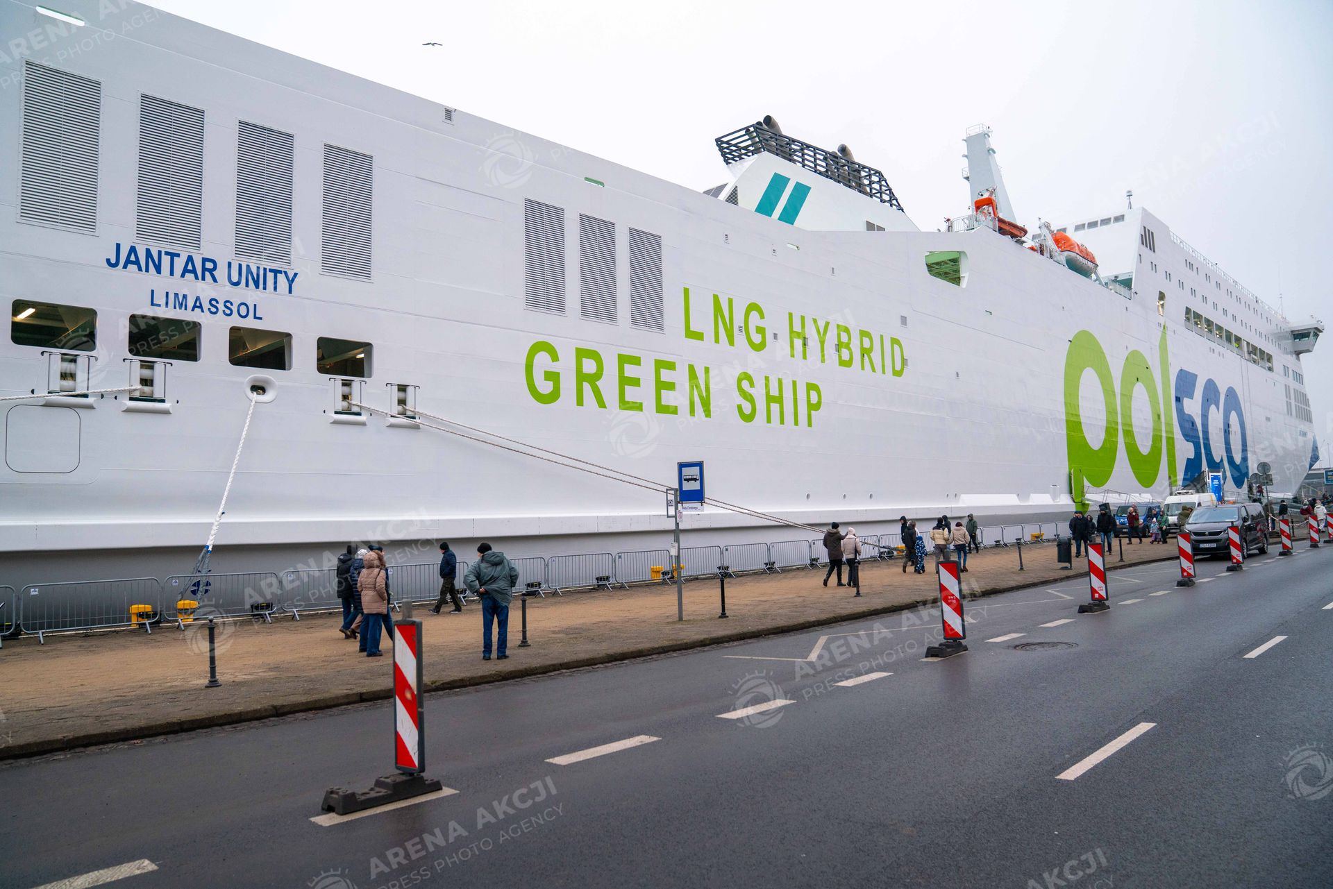 Szczecin 17.01.2026 Waly Chrobrego Ceremonia chrztu nowego promu Jantar Unity a najwiekszej i najnowoczesniejszej jednostki polskiej floty promowej. N/Z Prom Jantar Unity Fot. Marcin Jasinski/Arena Akcji